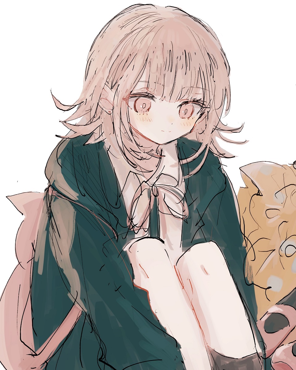 1girl backpack bag black_shirt blush closed_mouth collared_shirt danganronpa_(series) danganronpa_2:_goodbye_despair flipped_hair grey_shirt hair_ornament highres hood hood_down jacket long_sleeves medium_hair nanami_chiaki neck_ribbon no_hair_ornament nocoyaki pink_bag pink_eyes ribbon shirt shoes unworn_shoes solo two-tone_shirt white_background