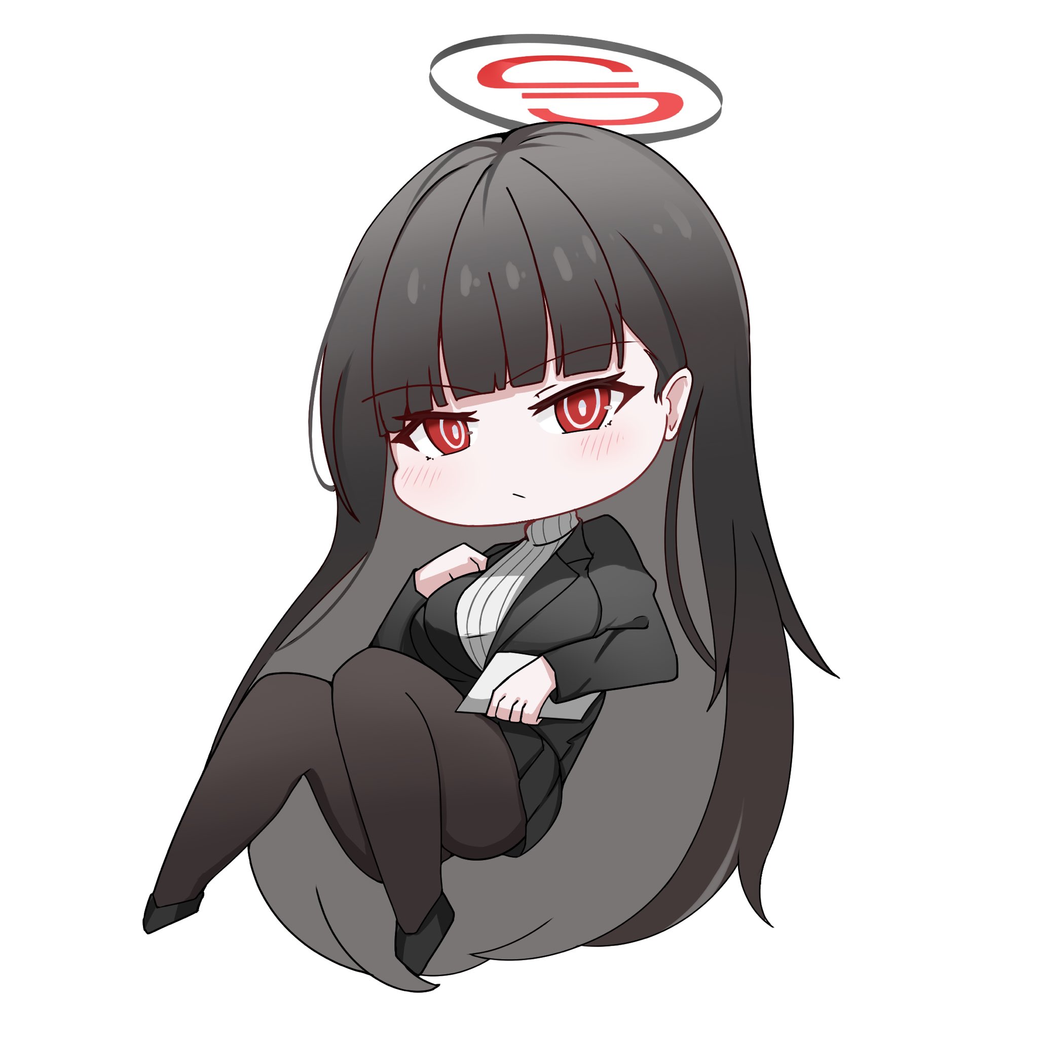 1girl black_hair black_jacket black_pantyhose blue_archive blush bright_pupils chibi halo highres holding holding_tablet_pc jacket lengkuass long_hair looking_at_viewer pantyhose red_eyes ribbed_sweater rio_(blue_archive) solo sweater tablet_pc turtleneck turtleneck_sweater very_long_hair white_pupils white_sweater