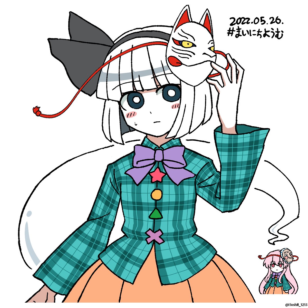 2girls black_eyes black_hairband bow bowtie bright_pupils circle commentary cosplay cowboy_shot dated fox_mask ghost hairband hata_no_kokoro hata_no_kokoro_(cosplay) highres hoshii_1213 hyottoko_mask konpaku_youmu konpaku_youmu_(ghost) long_hair looking_at_viewer mask mask_on_head multiple_girls orange_skirt pink_eyes pink_hair purple_bow purple_bowtie short_hair simple_background skirt solo_focus star_(symbol) sweatdrop touhou triangle twitter_username white_background white_hair white_pupils