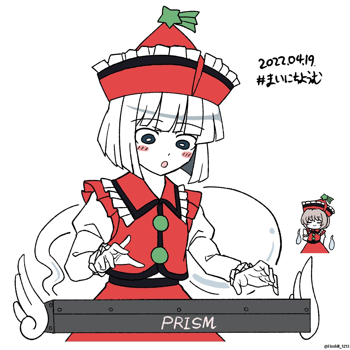 2girls black_eyes bright_pupils brown_hair closed_eyes commentary_request cosplay dated frilled_hat frills ghost hat hat_ornament highres hoshii_1213 instrument keyboard_(instrument) konpaku_youmu konpaku_youmu_(ghost) long_sleeves lyrica_prismriver lyrica_prismriver_(cosplay) multiple_girls music open_mouth playing_instrument red_headwear red_shirt red_skirt shirt short_hair simple_background skirt solo_focus star_(symbol) star_hat_ornament touhou twitter_username white_background white_hair white_pupils