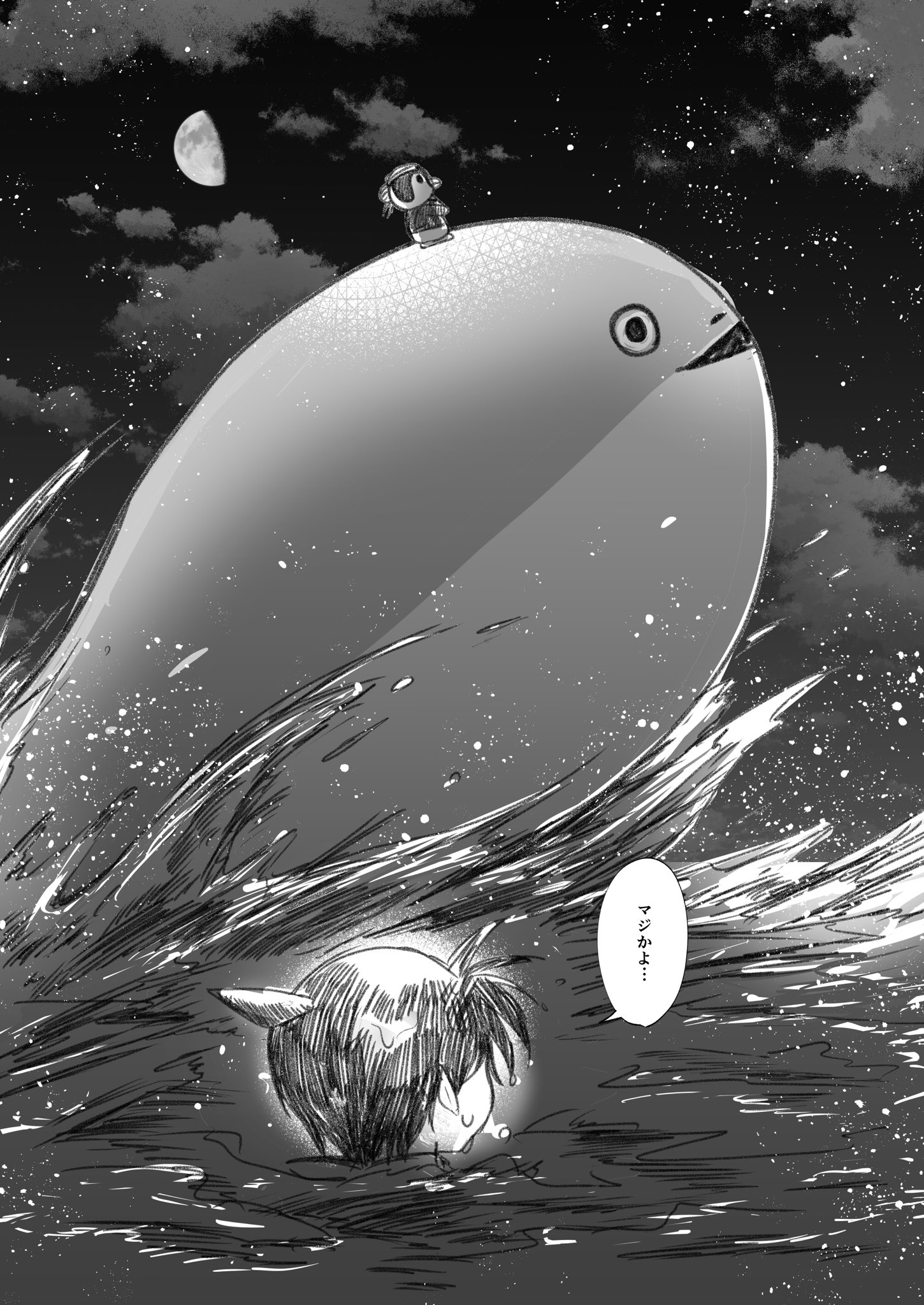 1boy animal_focus black_mouth character_request child cloud edogawa_conan fish greyscale half_moon highres meitantei_conan meitantei_conan_kurogane_no_submarine monochrome moon night ocean open_mouth outdoors sacabambaspis sky solo speech_bubble star_(sky) starry_sky swimming tan18-k translated triangle_mouth water