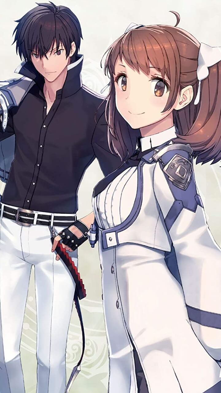 1boy 1girl anos_voldigoad black_hair black_shirt blush brown_eyes brown_hair dress highres long_hair maou_gakuin_no_futekigousha misa_ilioroagu pants pigtail ribbon shirt short_hair smile white_dress white_pants white_ribbon