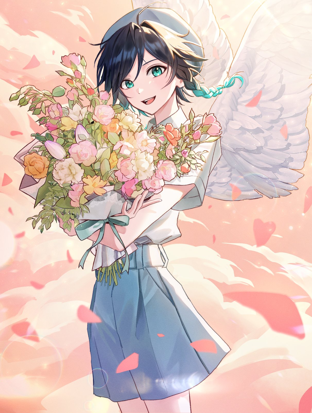 1boy alternate_costume aqua_eyes aqua_hair beret black_hair blue_shorts bouquet braid collared_shirt feathered_wings flower genshin_impact gradient_hair hat highres holding holding_bouquet male_focus multicolored_hair open_mouth pponnya shirt short_hair short_hair_with_long_locks short_sleeves shorts smile solo twin_braids venti_(genshin_impact) white_hat white_shirt white_wings wings