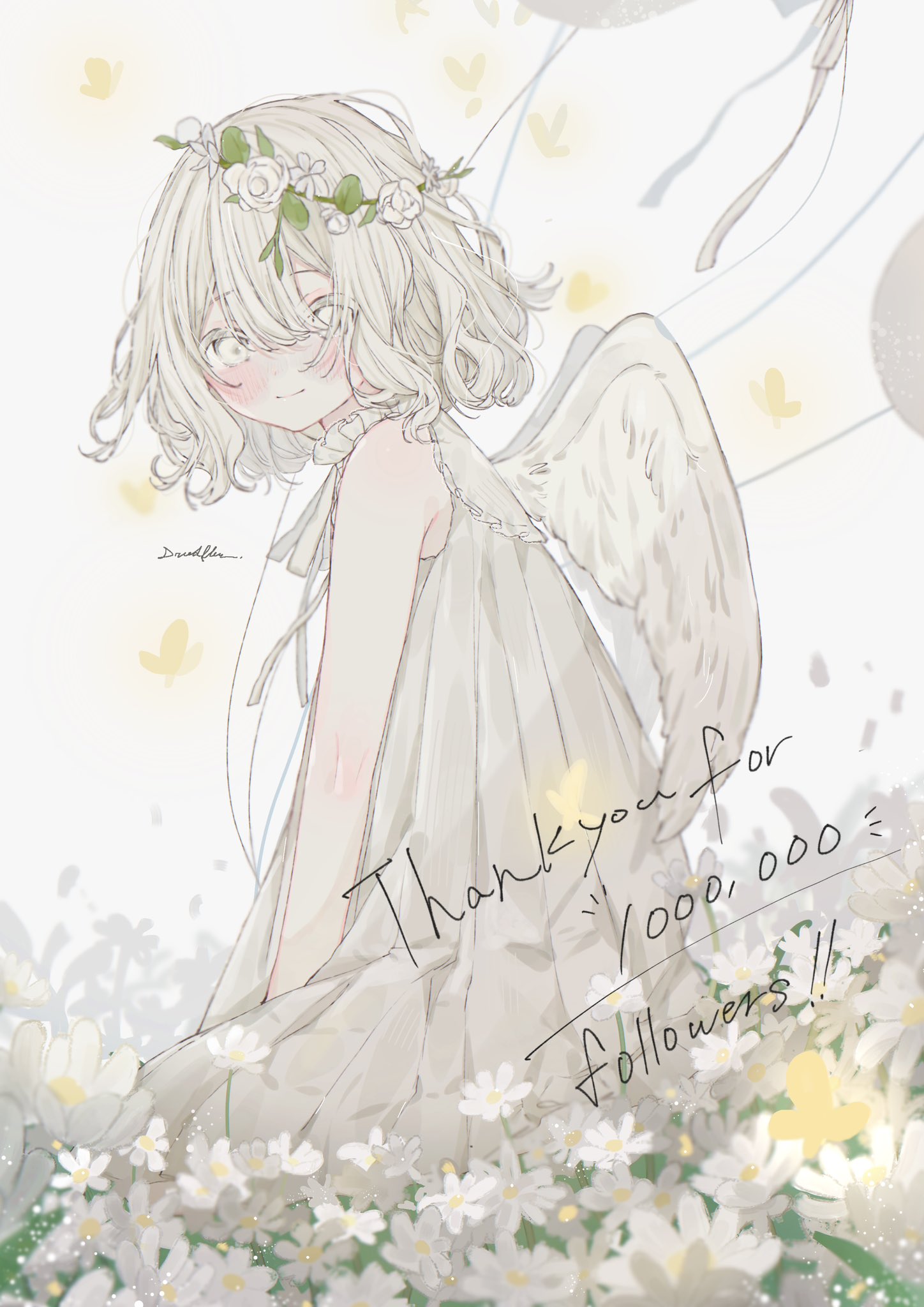 1girl angel dress driedflower field flower flower_field highres kneeling medium_hair original solo white_dress white_hair wings