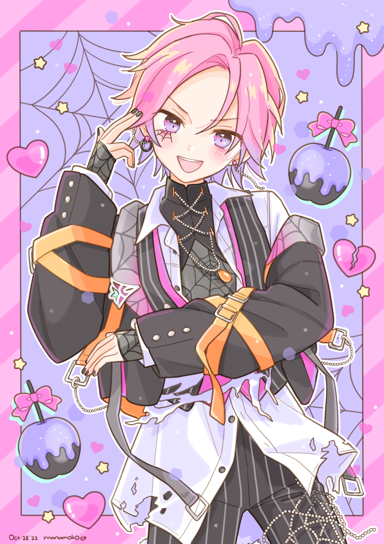 1boy apple blush border bow broken_heart ensemble_stars! food fruit heart highres long_sleeves looking_at_viewer male_focus manamoko_(fancy_surprise!) official_alternate_costume open_mouth oukawa_kohaku pink_border pink_bow pink_hair purple_background purple_eyes smile solo spider_(ensemble_stars!) star_(symbol) striped_border