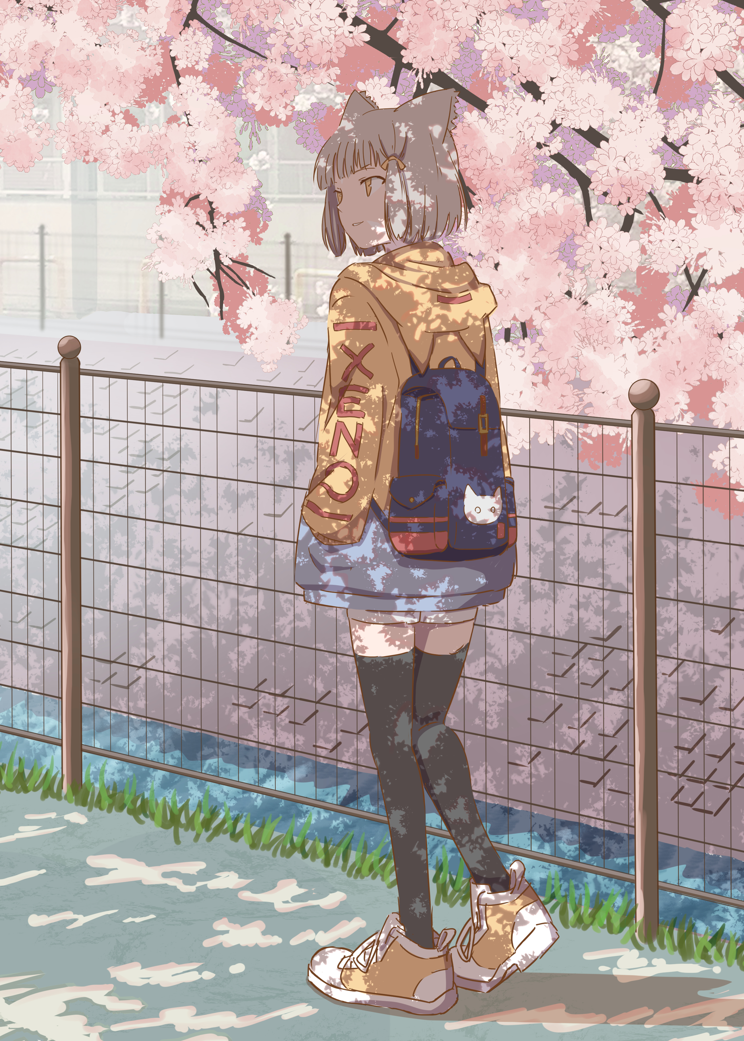 1girl absurdres animal_ears backpack bag black_thighhighs branch brown_hair cat_ears cat_girl cherry_blossoms contemporary full_body highres hood hoodie kageyasu long_sleeves nia_(xenoblade) outdoors shadow shoes shorts sneakers solo thighhighs walking white_shorts xenoblade_chronicles_(series) xenoblade_chronicles_2 yellow_eyes yellow_hoodie yellow_shoes