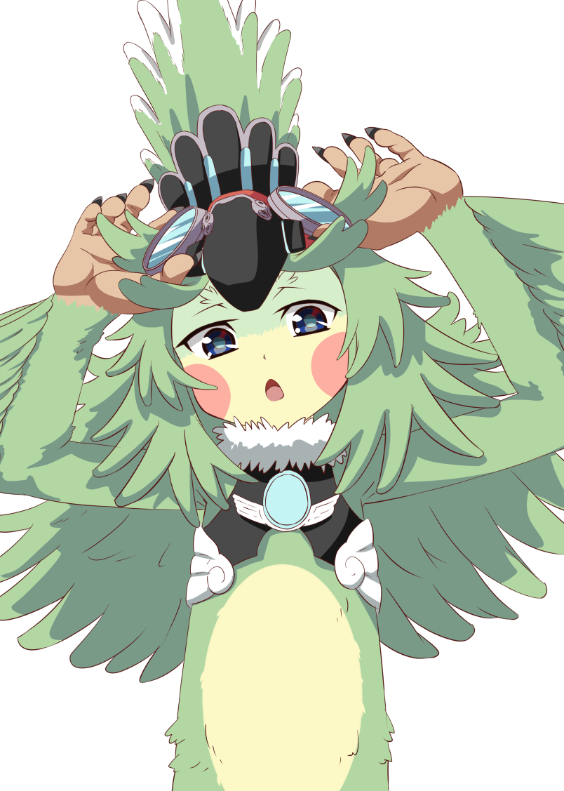 1girl :o arms_up blue_eyes blush body_fur feathered_wings feathers finch_(xenoblade) goggles goggles_on_head green_feathers green_hair green_wings kageyasu looking_at_viewer open_mouth simple_background solo upper_body white_background wings xenoblade_chronicles_(series) xenoblade_chronicles_2