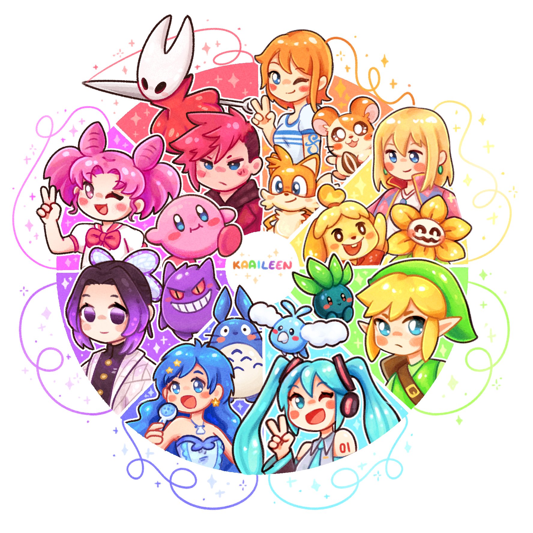 6+boys 6+girls animal animal_crossing aqua_hair aqua_necktie arthropod_girl artist_name bare_shoulders bird bishoujo_senshi_sailor_moon black_hair blonde_hair blue_eyes blue_hair blush bow bowtie character_request chibi_usa collared_shirt color_wheel_challenge copyright_request crossover detached_sleeves dog_girl dress earrings flower flowey_(undertale) fox furry furry_female furry_male gen_1_pokemon gen_3_pokemon gengar gradient_hair green_headwear grey_shirt hamster hamtaro hamtaro_(series) hatsune_miku highres holding holding_microphone hollow_knight hornet_(hollow_knight) houshou_hanon houshou_hanon_(idol) howl_no_ugoku_shiro howl_(howl_no_ugoku_shiro) isabelle_(animal_crossing) jewelry jitome kaaileen kimetsu_no_yaiba kirby kirby_(series) kochou_shinobu link looking_at_viewer medium_hair mermaid_melody_pichi_pichi_pitch microphone multicolored_hair multiple_boys multiple_crossover multiple_drawing_challenge multiple_girls nami_(one_piece) nami_(one_piece)_(east_blue) necktie nintendo no_sclera oddish one_eye_closed one_piece open_mouth orange_hair outline pink_eyes pink_hair pointy_ears pokemon pokemon_(creature) purple_eyes purple_hair red_bow red_bowtie red_sailor_collar sailor_collar sega shirt short_hair smile sonic_(series) sparkle star_(symbol) star_earrings strapless strapless_dress swablu tails_(sonic) tareme the_legend_of_zelda tonari_no_totoro totoro undercut undertale upper_body utdr_(toby_fox) v vocaloid white_background white_outline wink