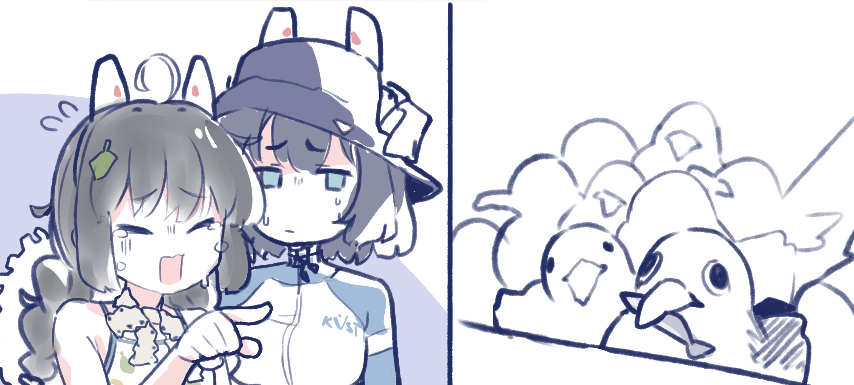 2girls 2koma animal_ear_headphones animal_ears bird blue_archive braid comic crying fake_animal_ears fish hat headphones highres komori_yu leaf leaf_on_head meme miyu_(blue_archive) miyu_(swimsuit)_(blue_archive) multiple_girls official_alternate_costume official_alternate_hairstyle parody pointing rabbit_ear_headphones rabbit_ears saki_(blue_archive) saki_(swimsuit)_(blue_archive) seagull straw_hat sweat swimsuit tears twin_braids woman_yelling_at_cat_(meme)