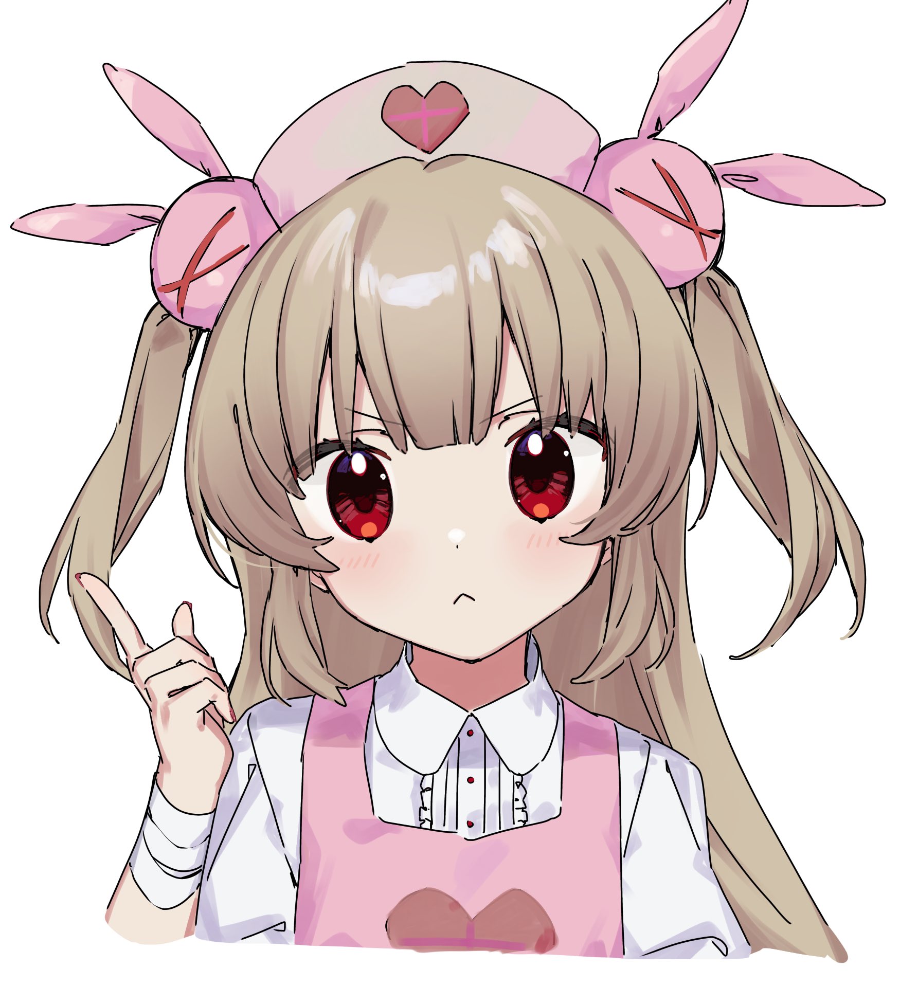 1girl :< apron bandaged_wrist bandages closed_mouth collared_shirt hair_ornament hat heart highres index_finger_raised light_blush light_brown_hair looking_at_viewer nano_(nan0ng) natori_sana natori_sana_(nurse) nurse_cap pink_apron pink_hat portrait rabbit_hair_ornament red_eyes sana_channel shirt simple_background solo two_side_up virtual_youtuber white_background white_shirt