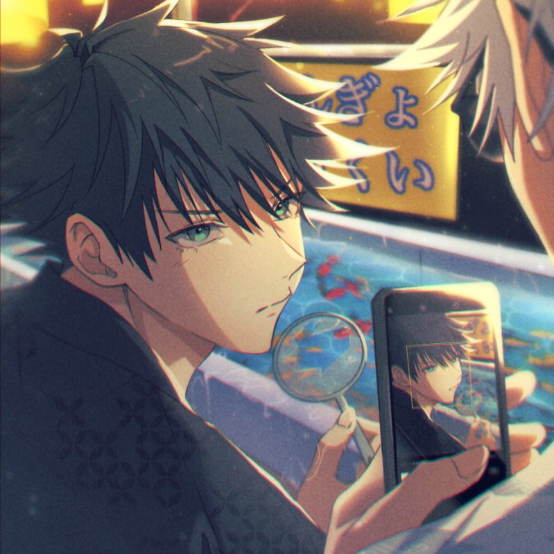 2boys bishounen black_hair camera_phone cellphone fish fish_tank fushiguro_megumi gojo_satoru green_eyes holding holding_magnifying_glass jujutsu_kaisen magnifying_glass male_focus mi_muuuu multiple_boys phone short_hair smartphone solo_focus water