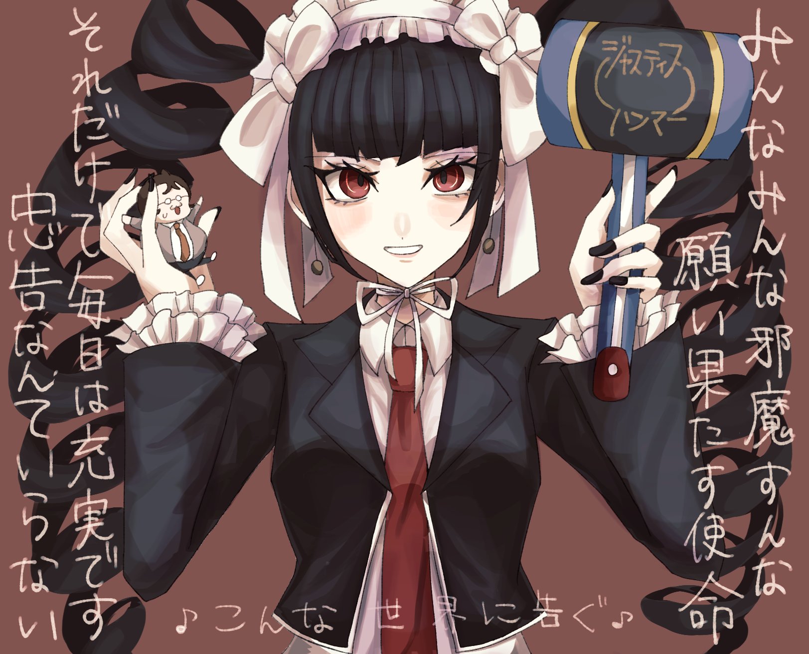 1girl black_jacket black_nails celestia_ludenberg collared_shirt danganronpa:_trigger_happy_havoc danganronpa_(series) doll drill_hair earrings frilled_jacket frills grin hand_up highres holding holding_doll holding_mallet jacket jewelry long_hair long_sleeves mallet nail_polish necktie open_clothes open_jacket red_background red_eyes red_necktie shirt shita_matsuge simple_background smile solo teeth translation_request twin_drills upper_body white_shirt yamada_hifumi