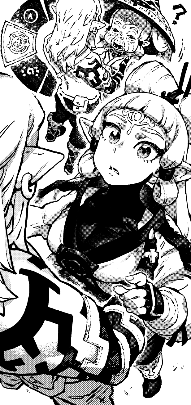 age_difference age_regression aged_down facial_mark forehead_mark gameplay_mechanics greyscale highres impa ireading link long_hair monochrome nintendo pointy_ears sheikah surprised tattoo the_legend_of_zelda the_legend_of_zelda:_tears_of_the_kingdom