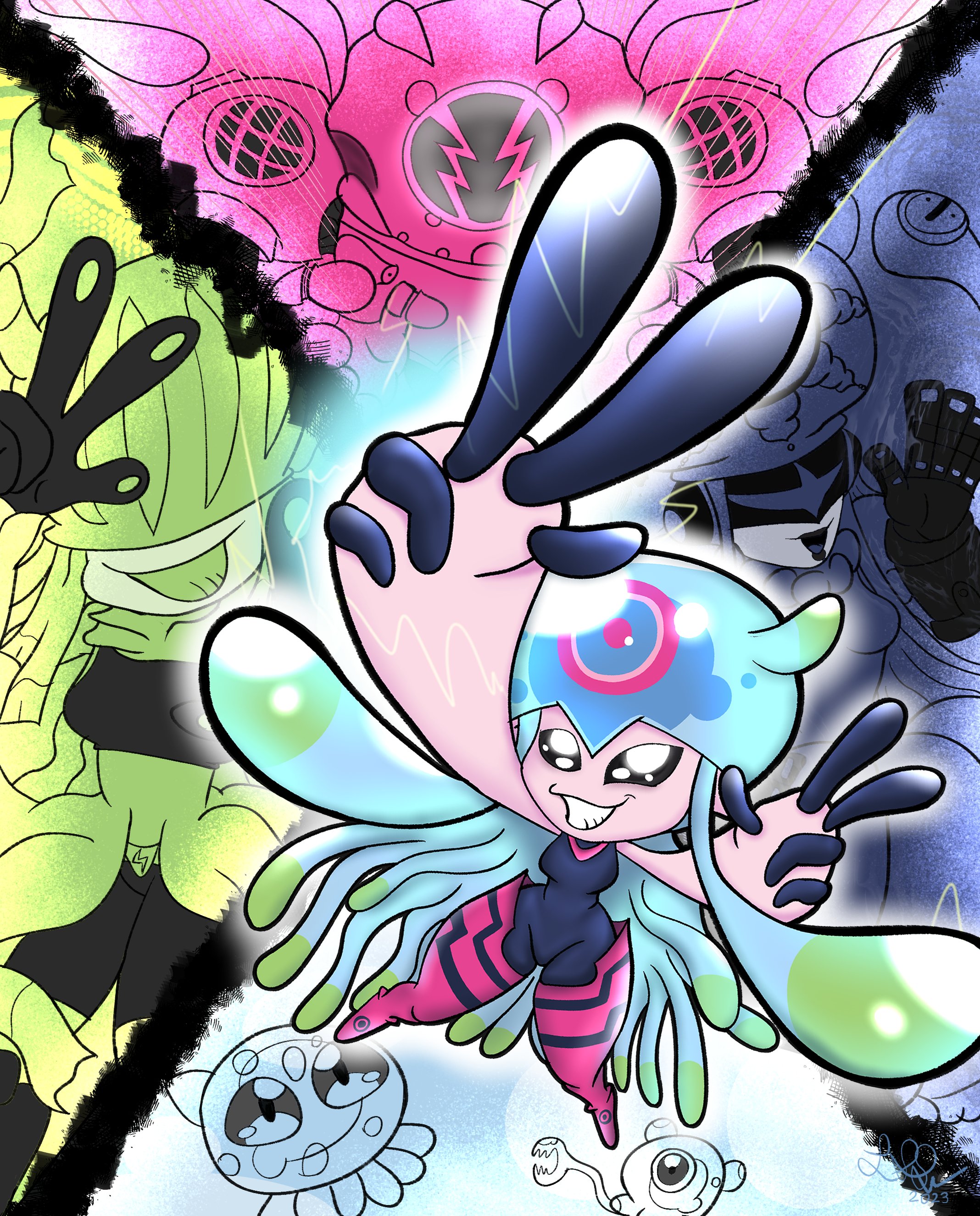 absurdres amphimon android armor digimon digimon_(creature) diving_suit full_armor gynoid highres jellyfish jellyfish_girl jellymon mask mecha_girl monster_girl puyomon puyoyomon robot_girl tentacle_hair tentacles teslajellymon thetismon