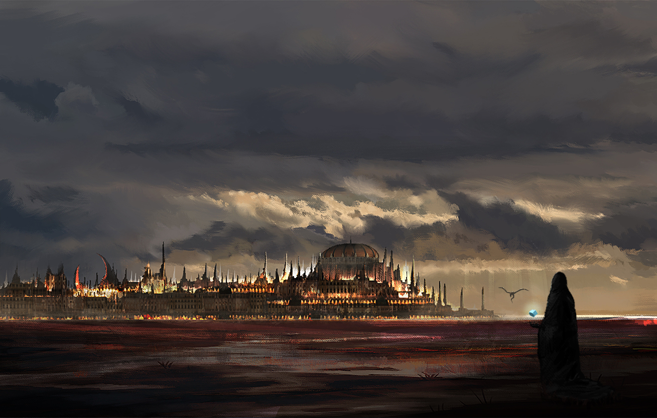 1other city cloud cloudy_sky cube dome facing_away fantasy faux_traditional_media floating from_behind hood hood_up hooded_robe horizon kgt_(pixiv12957613) landscape original robe scenery sky solo wide_shot