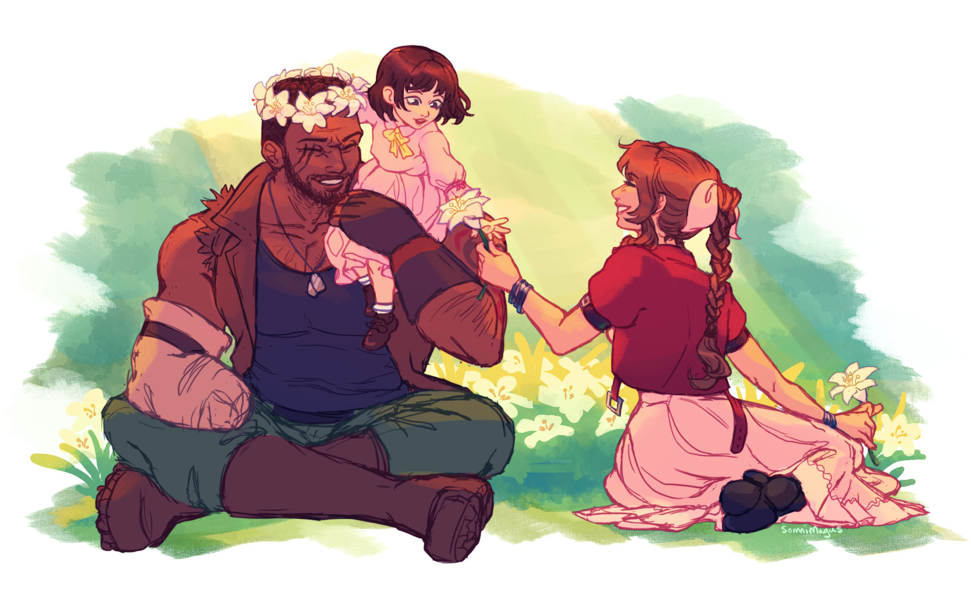 1boy 2girls aerith_gainsborough bare_shoulders barret_wallace black_hair boots bracelet braid braided_ponytail breasts brown_footwear brown_gloves brown_hair brown_vest child closed_eyes dark-skinned_male dark_skin dress facial_hair final_fantasy final_fantasy_vii final_fantasy_vii_remake fingerless_gloves flower gloves grass green_pants hair_ribbon highres holding holding_flower indian_style jacket jewelry long_hair looking_at_another marlene_wallace medium_breasts multiple_girls outdoors pants parted_lips pink_dress pink_ribbon profile red_jacket ribbon scar scar_across_eye scar_on_face short_hair sitting smile somnimagus square_enix vest