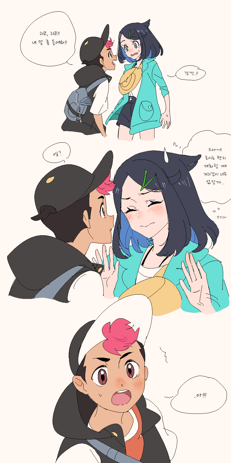 1boy 1girl black_hair black_shorts blush brown_eyes closed_eyes closed_mouth coat commentary_request cowlick eyelashes flying_sweatdrops green_coat hair_ornament hairclip hands_up hat highres korean_commentary korean_text liko_(pokemon) motion_lines nintendo nirin open_clothes open_coat pokemon pokemon_(anime) pokemon_horizons roy_(pokemon) shirt short_hair shorts speech_bubble vest white_background white_shirt yellow_bag