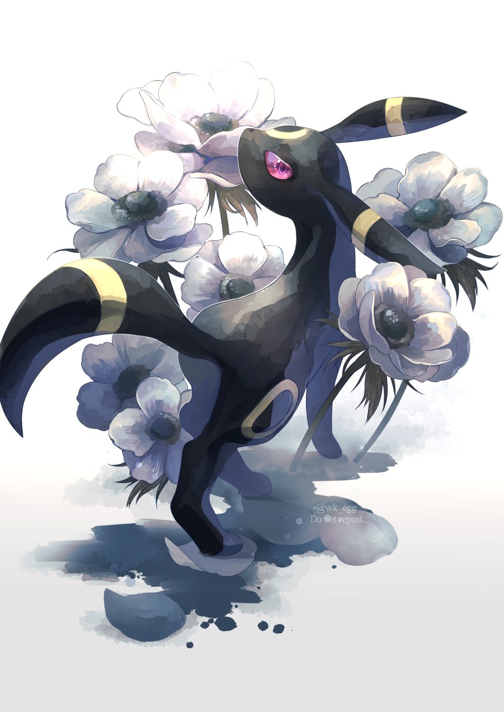 commentary_request eko_(wk_egg) flower gen_2_pokemon highres looking_at_viewer looking_back nintendo no_humans pokemon pokemon_(creature) purple_eyes solo standing twitter_username umbreon watermark white_background
