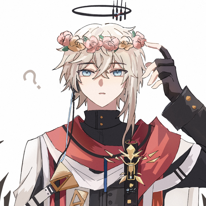 1boy ? arknights arm_up black_gloves black_shirt blue_eyes chuanshanjiashuoleshenme78183 commentary_request executor_(arknights) fingerless_gloves flower flower_wreath gloves grey_hair hair_between_eyes halo head_wreath looking_at_viewer male_focus parted_lips pink_flower shirt simple_background solo upper_body white_background yellow_flower