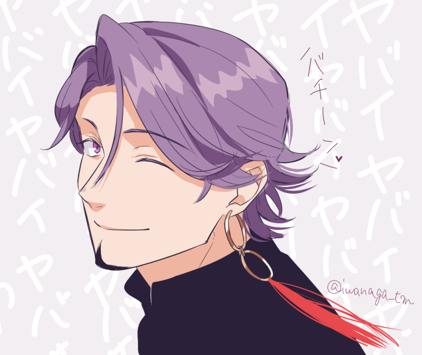 artist_name black_shirt duryodhana_(fate) earrings facial_hair fate/grand_order fate_(series) from_side goatee iwanaga_tm jewelry looking_at_viewer male_focus mature_male one_eye_closed purple_eyes purple_hair shirt short_hair single_earring upper_body white_background