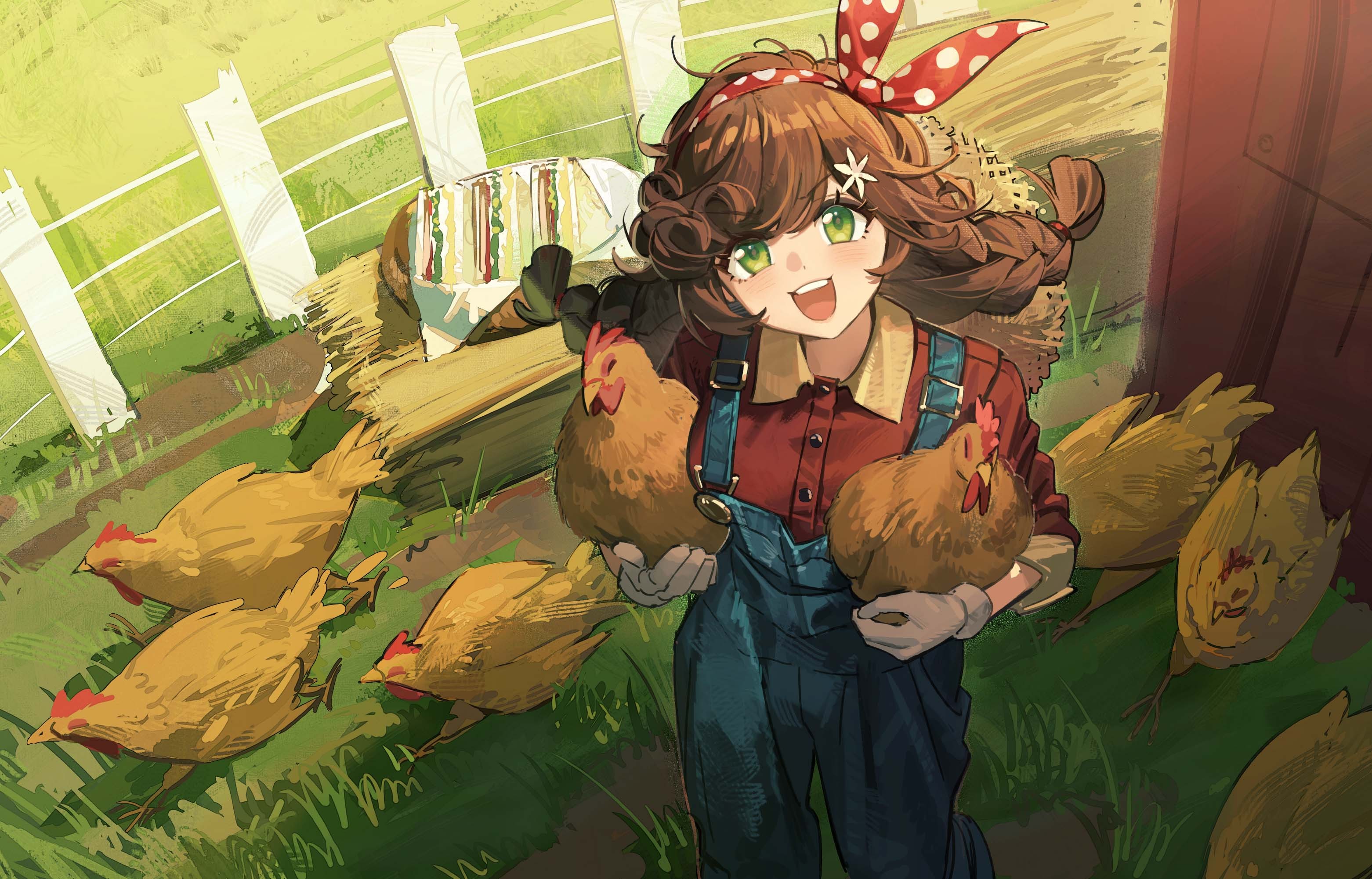 1girl alternate_costume animal bird blue_overalls blush braid brown_hair bunny_bunny_(reverse:1999) chicken collared_shirt commentary fence gloves grass green_eyes hat unworn_hat unworn_headwear highres holding holding_animal looking_at_viewer open_mouth outdoors overalls pg_(pgouwoderen) polka_dot_hairband red_shirt reverse:1999 shirt sidelocks sleeves_rolled_up standing straw_hat teeth twin_braids upper_teeth_only white_gloves