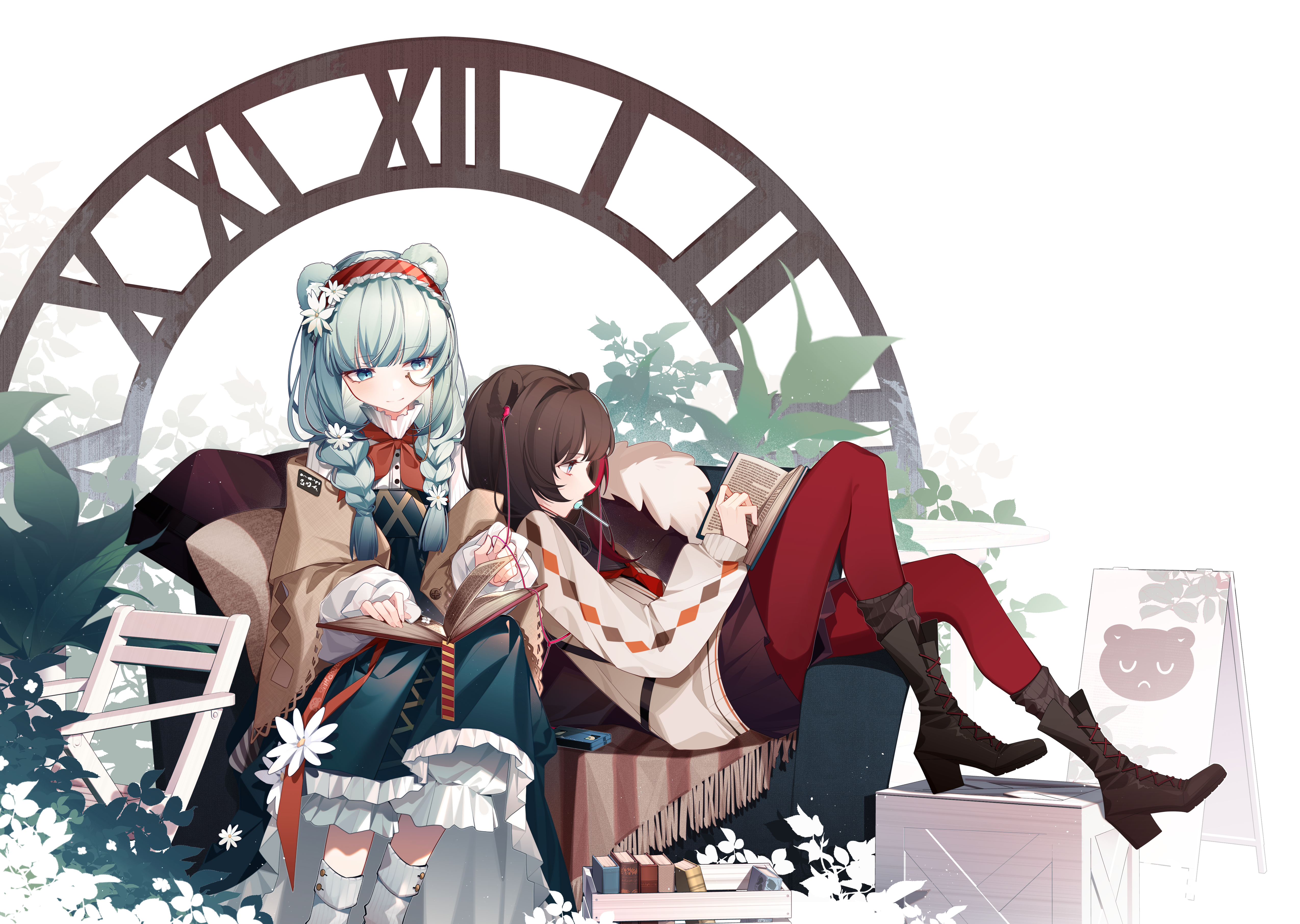 2girls absurdres aqua_hair argyle_cardigan argyle_clothes arknights black_footwear black_skirt bloomers blue_dress blue_eyes book boots braid brown_hair candy cardigan chair closed_mouth couch crate dress duyue_moritz earphones feet_out_of_frame flower folding_chair food food_in_mouth hair_flower hair_ornament hairband highres istina_(arknights) istina_(bibliosmia)_(arknights) knee_boots leaning_back leaning_on_person lollipop long_hair long_sleeves miniskirt monocle multicolored_hair multiple_girls neck_ribbon neckerchief official_alternate_costume on_couch open_book pantyhose reading red_hair red_hairband red_neckerchief red_pantyhose red_ribbon ribbon roman_numeral school_uniform simple_background sitting skirt smile socks streaked_hair striped_clothes striped_hairband twin_braids two-tone_hair underwear white_background white_cardigan white_flower white_socks zima_(arknights)