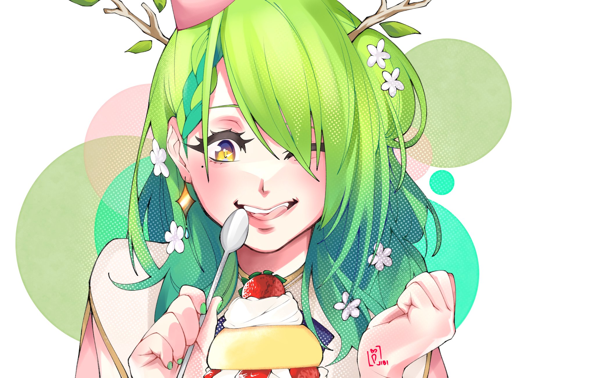1girl antlers artist_name birthday_cake blue_ribbon braid braided_bangs branch cake ceres_fauna ceres_fauna_(1st_costume) clenched_hand colored_tips dress earrings flower food green_hair green_nails hair_flower hair_ornament hat highres holding holding_spoon hololive hololive_english horns jewelry lips medium_hair mole mole_under_eye mpmrpjb multicolored_hair nail_polish one_eye_closed party_hat ribbon single_braid smile solo spoon streaked_hair teeth tongue tongue_out upper_teeth_only virtual_youtuber white_dress yellow_eyes