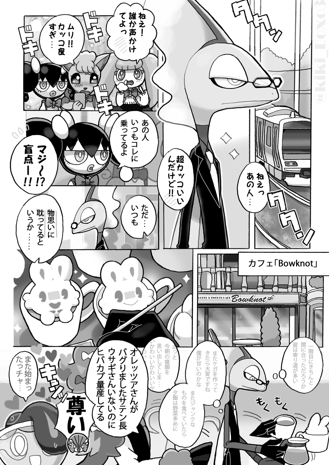 2boys 4girls afterimage animal_hands artist_name barista blush body_fur bow bowtie bus cafe cellphone closed_eyes closed_mouth clothed_pokemon coffee_pot collared_shirt comic cup drink english_text expressionless fins flying_sweatdrops formal_clothes from_side furry furry_female furry_male galarian_form galarian_ponyta gardevoir gen_1_pokemon gen_3_pokemon gen_5_pokemon gen_7_pokemon gen_8_pokemon glasses gothorita greyscale hair_bow half-closed_eyes head_fins heart highres holding holding_cup holding_drink holding_phone hooves indoors inteleon jacket japanese_text jitome kiki_(431642) latte_art long_hair long_sleeves looking_down monochrome motion_lines motor_vehicle mug multiple_boys multiple_girls multiple_views necktie nintendo nose_blush outline personification phone pince-nez pokemon pokemon_(creature) profile reptile_boy school_uniform scorbunny shirt short_hair sinistea smartphone sparkle speech_bubble spoken_blush standing steenee suit sweater_vest talking thought_bubble translation_request twintails twitter_username u_u upper_body vest vulpix watermark white_outline