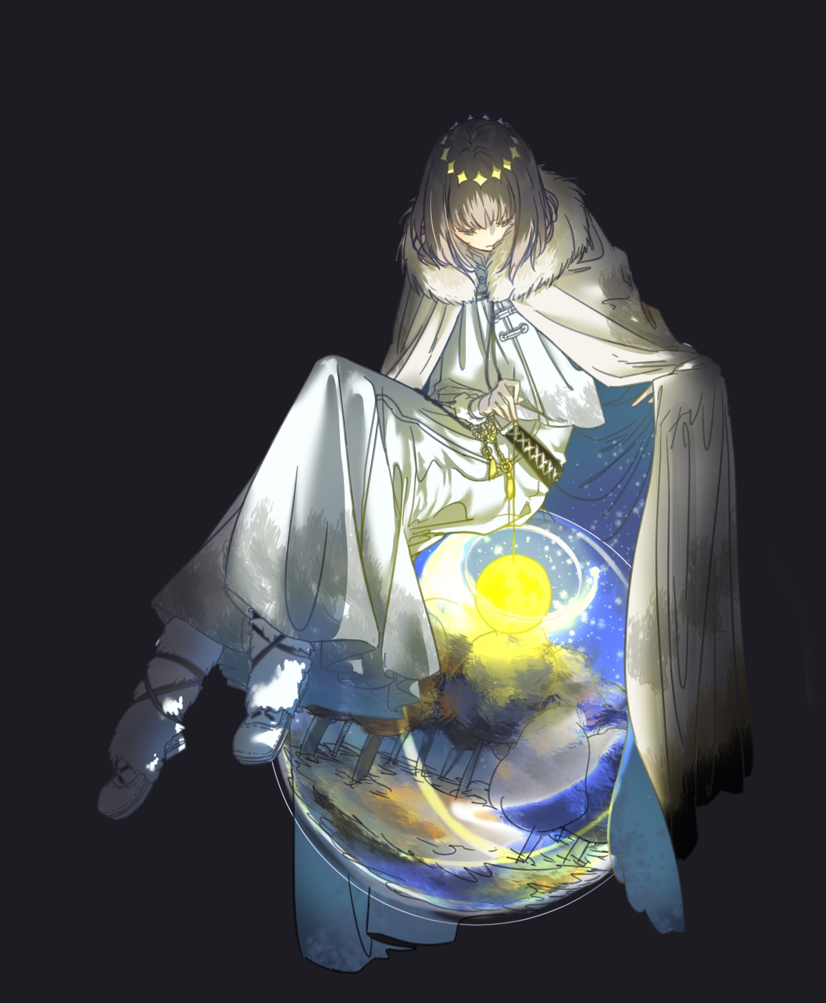 1boy blue_eyes cloak crown diamond_hairband fate/grand_order fate_(series) fur-trimmed_cloak fur_trim grey_hair highres long_sleeves looking_down male_focus nekotasu oberon_(fate) oberon_(second_ascension)_(fate) orb shirt sitting solo white_cloak white_footwear white_shirt