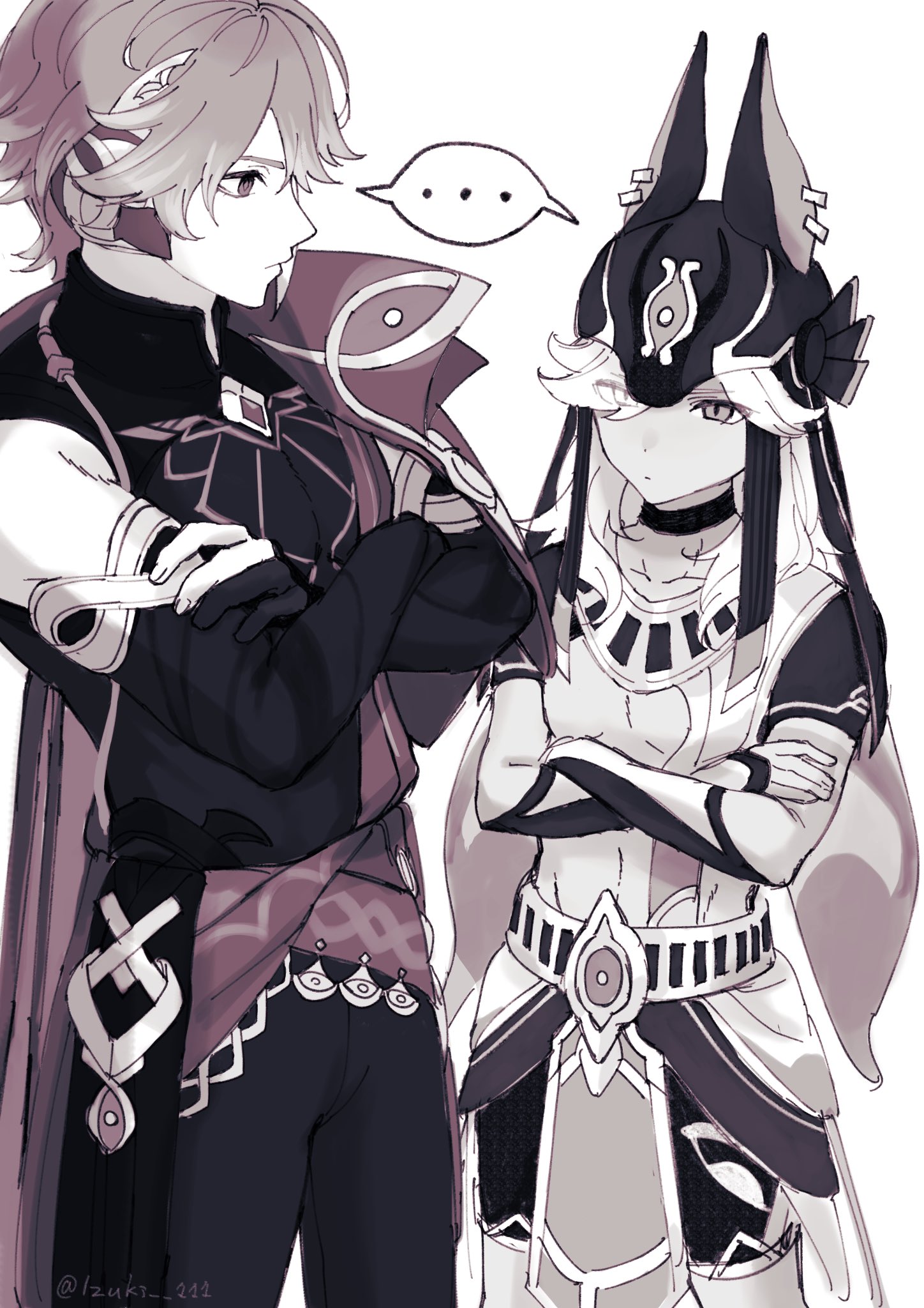 ... 2boys 39_iduki alhaitham_(genshin_impact) animal_hat cape chest_jewel closed_mouth cyno_(genshin_impact) detached_sleeves eye_contact genshin_impact gloves greyscale hair_over_one_eye hat highres long_hair looking_at_another male_focus monochrome multiple_boys pants partially_fingerless_gloves simple_background sparkle spoken_ellipsis twitter_username