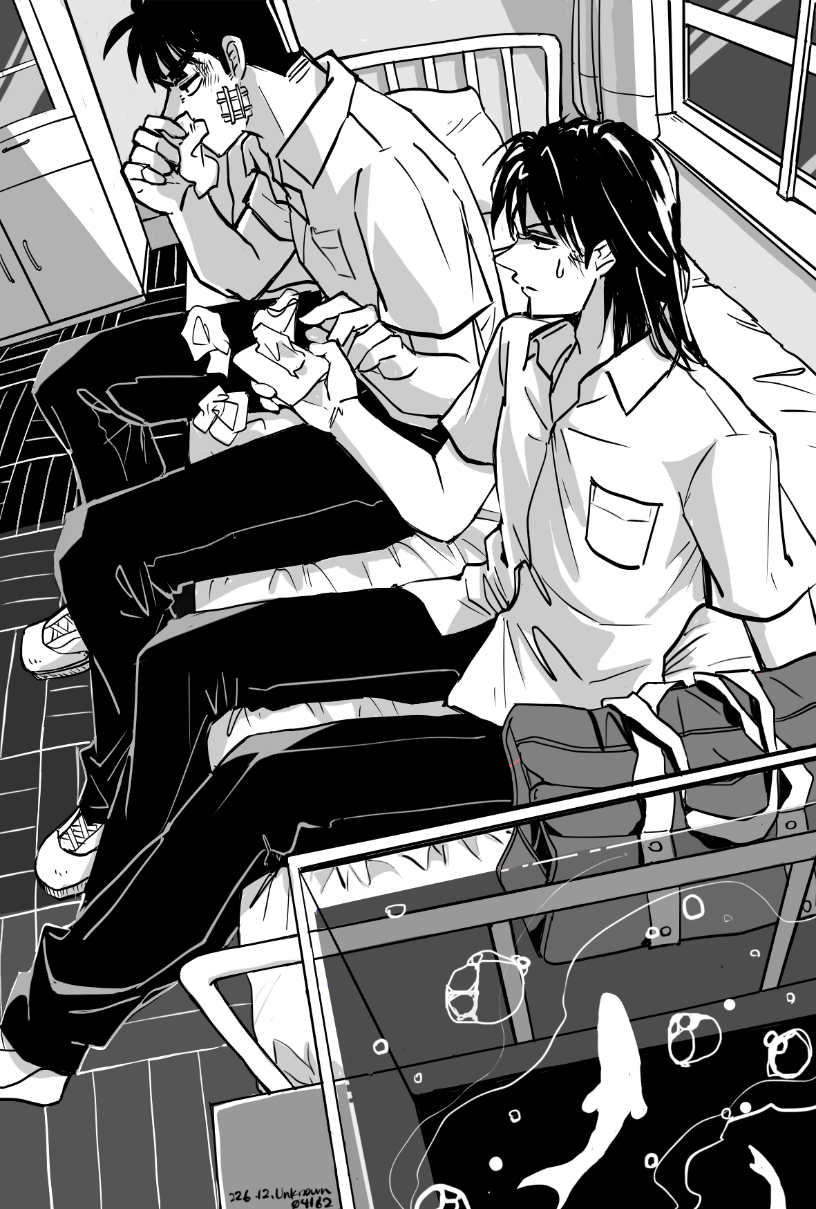 2boys aquarium artist_name bag bandage_on_face bandages breast_pocket closed_mouth collared_shirt commentary_request couch dated fish fisheye frown full_body greyscale highres ichijou_seiya indoors infirmary joukyou_seikatsuroku_ichijou tobaku_mokushiroku_kaiji long_hair looking_at_another male_focus monochrome multiple_boys murakami_tamotsu pants pocket school_bag scratches shirt shoes short_sleeves sitting sneakers unknown03162 used_tissue
