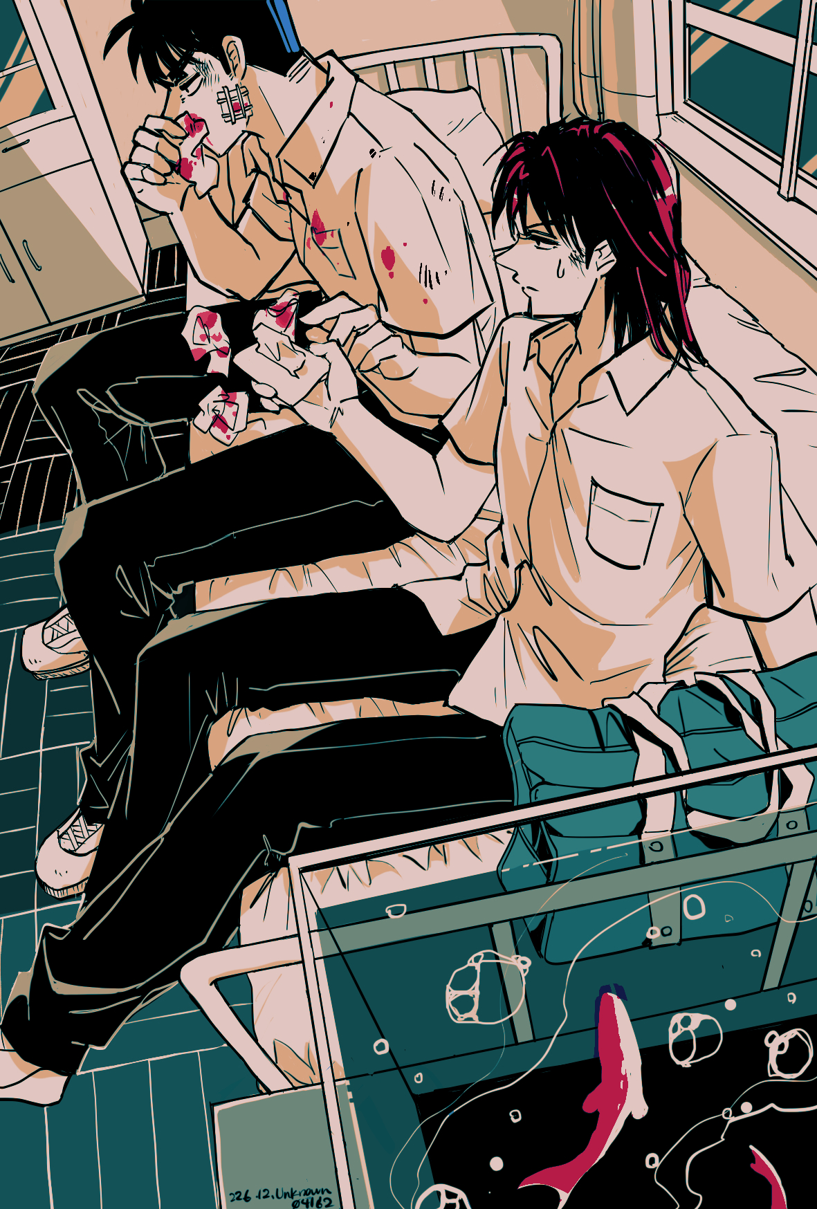 2boys aquarium artist_name bag bandage_on_face bandages black_eyes black_hair black_pants blood blood_on_clothes blood_on_hands blue_bag breast_pocket closed_mouth collared_shirt commentary_request couch dated fish fisheye frown full_body highres ichijou_seiya indoors infirmary joukyou_seikatsuroku_ichijou tobaku_mokushiroku_kaiji limited_palette long_hair looking_at_another male_focus multiple_boys murakami_tamotsu nosebleed pants pocket red_hair school_bag scratches shirt shoes short_sleeves sitting sneakers unknown03162 used_tissue white_shirt