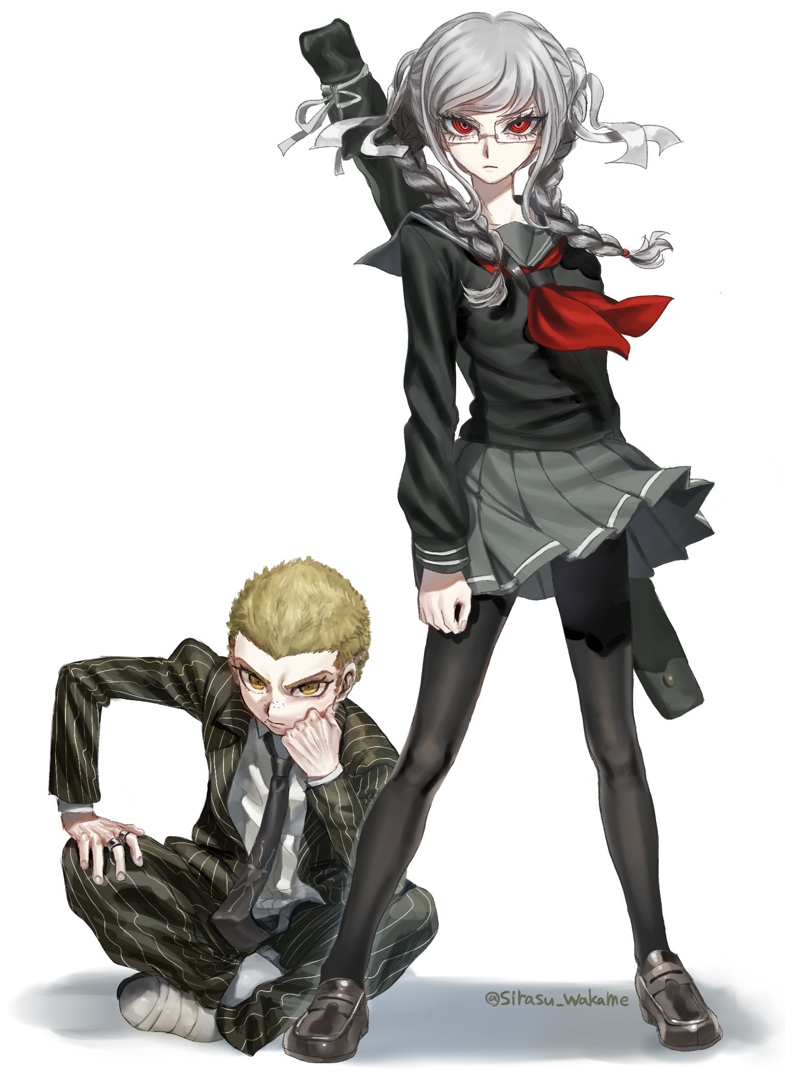 1boy 1girl black_pantyhose blonde_hair braid brown_jacket brown_pants danganronpa_(series) danganronpa_2:_goodbye_despair freckles full_body glasses grey_hair grey_ribbon grey_skirt hair_ribbon highres jacket jewelry kuzuryu_fuyuhiko long_hair long_sleeves miniskirt neckerchief necktie pants pantyhose pekoyama_peko pleated_skirt red_eyes red_neckerchief ribbon ring school_uniform serafuku shirt shoes short_hair sirasu_wakame sitting skirt standing striped_clothes striped_jacket striped_pants twin_braids white_background
