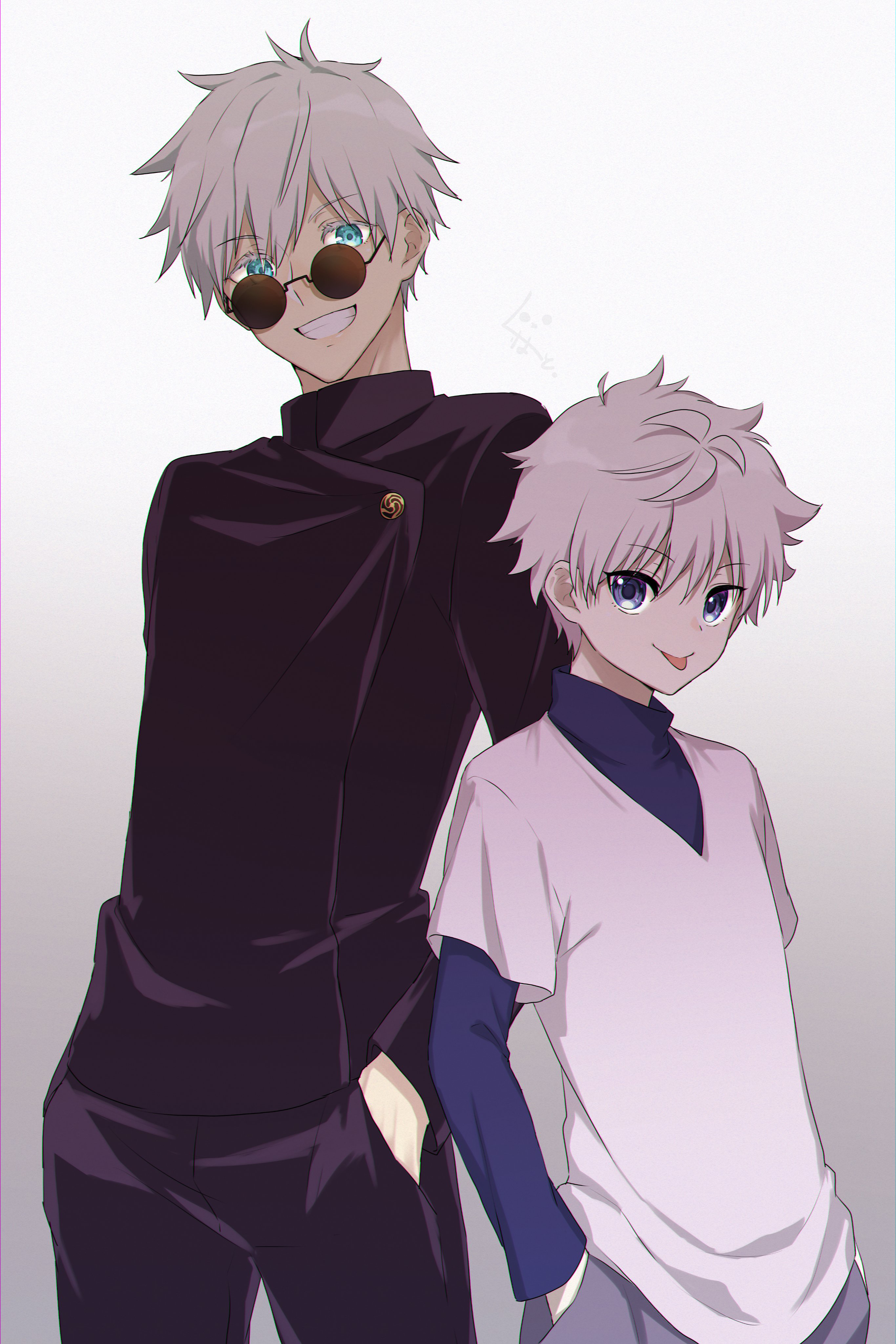 2boys :p absurdres black_jacket black_pants blue_eyes blue_shirt cowboy_shot crossover gojo_satoru grey_pants grin guribato hands_in_pockets highres hunter_x_hunter jacket jujutsu_kaisen jujutsu_tech_uniform killua_zoldyck long_sleeves look-alike looking_at_viewer male_focus multiple_boys pants round_eyewear shirt short_hair smile standing sunglasses teeth tongue tongue_out white_background white_hair white_shirt
