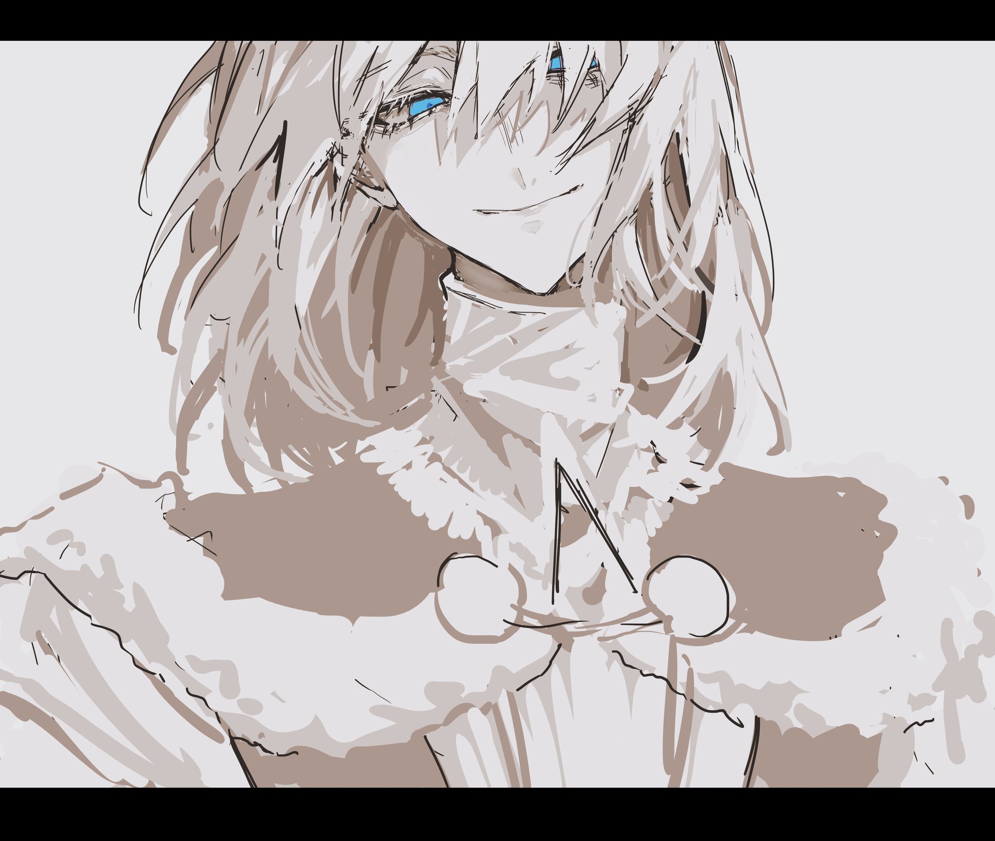 1boy blue_eyes cloak crown diamond_hairband fate/grand_order fate_(series) fur-trimmed_cloak fur_trim grey_hair highres looking_at_viewer male_focus medium_hair missing_wings norai0813 oberon_(fate) oberon_(first_ascension)_(fate) partially_colored simple_background smile solo upper_body white_background