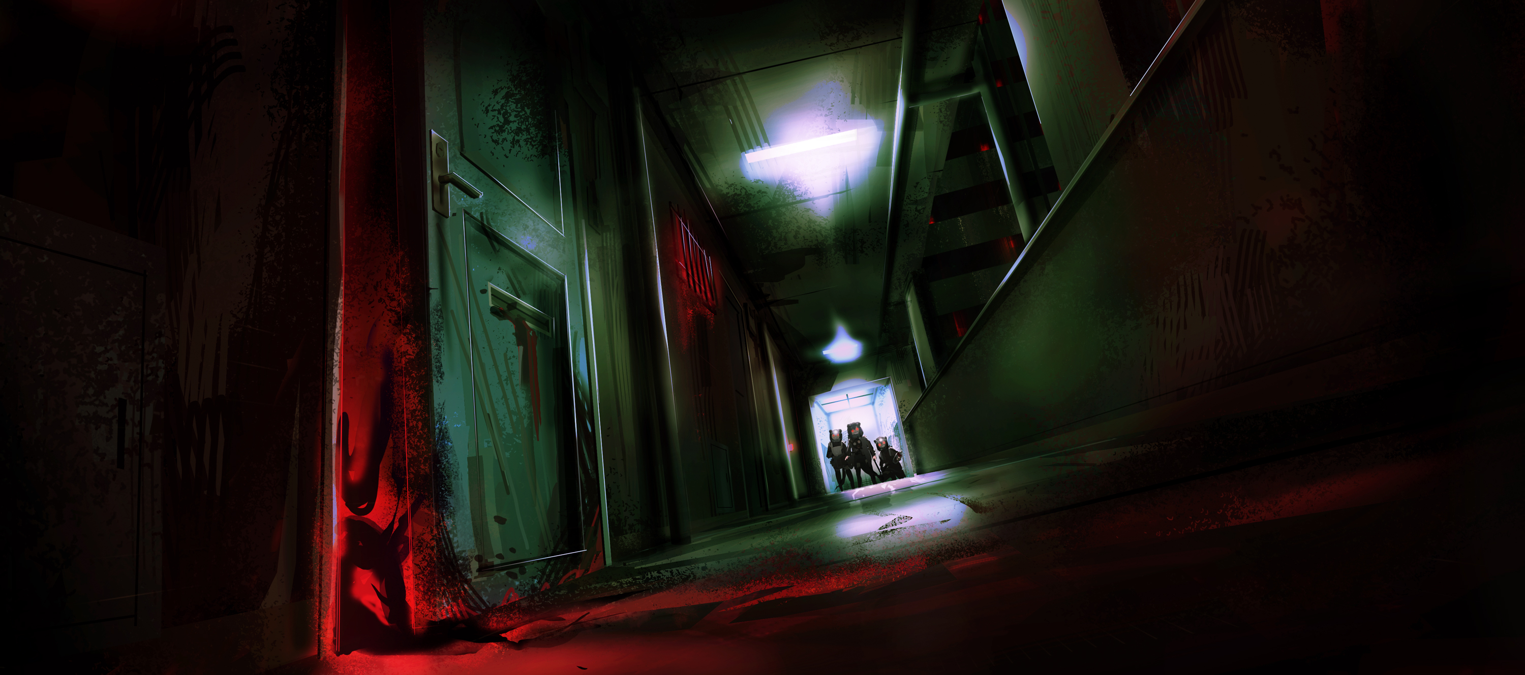 3girls animal_ears arai-san_mansion barred_window blood bottle commentary_request crowbar door elevator elevator_door gas_mask giant_otter_(kemono_friends)_(kuro_(kurojill)) haru_akira headlamp highres holding holding_bottle horror_(theme) indoors jacket kemono_friends light mask mask_around_neck multiple_girls otter_ears otter_tail partial_commentary plastic_bottle tail