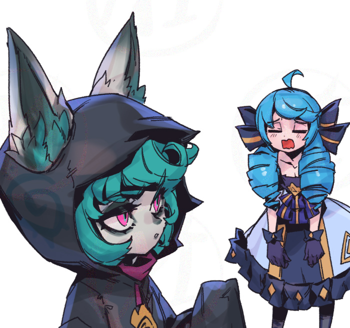 2girls ahoge black_bow black_dress black_gloves black_hoodie blush bow closed_eyes collarbone dress ears_through_headwear facing_viewer feet_out_of_frame gloves green_hair grey_dress gwen_(league_of_legends) hair_bow hood hood_up hoodie league_of_legends leaning_forward long_hair multiple_girls phantom_cross pink_background simple_background vex_(league_of_legends) yordle