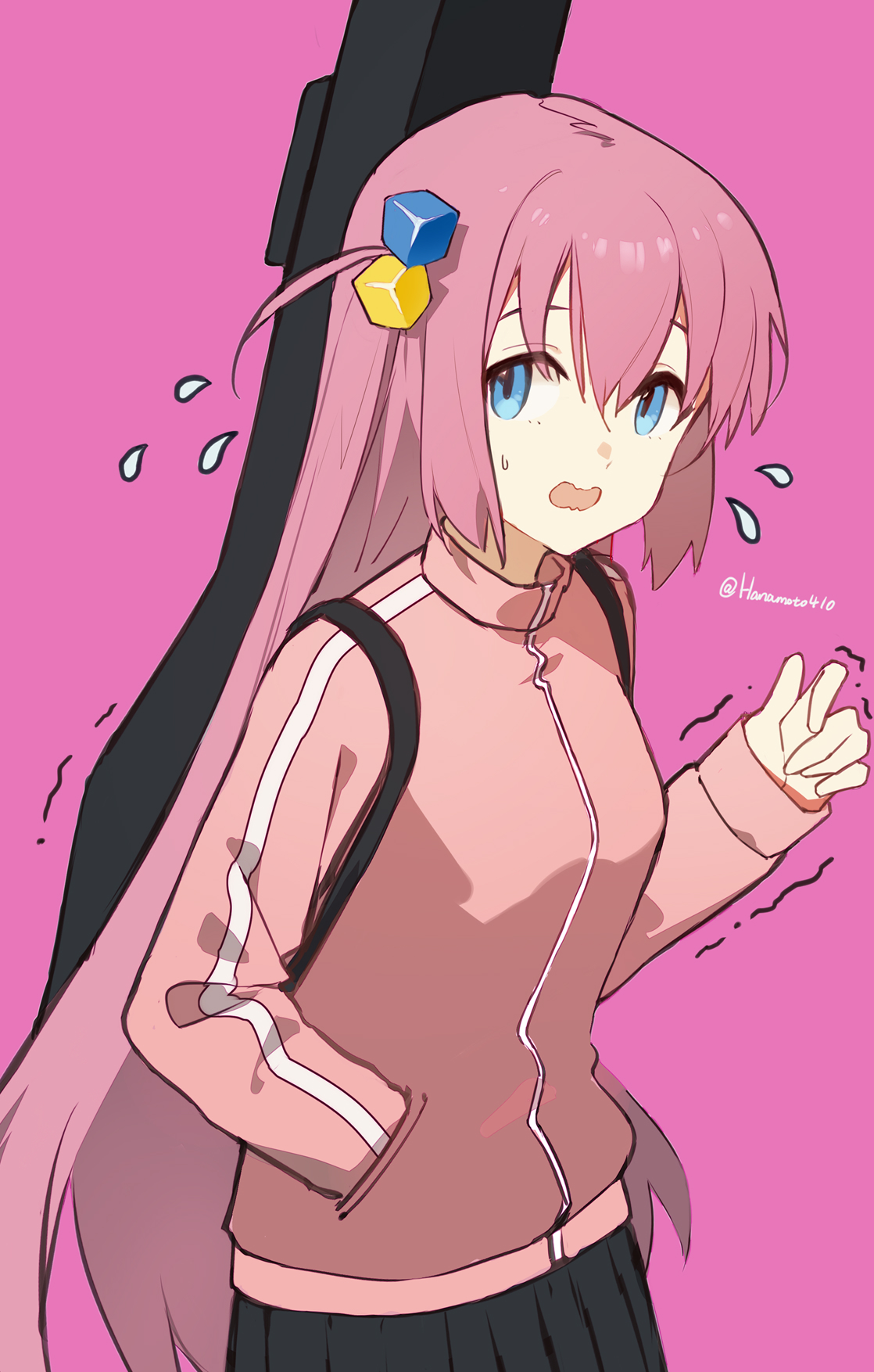 1girl black_skirt blue_eyes bocchi_the_rock! commentary cube_hair_ornament flying_sweatdrops gotoh_hitori hair_between_eyes hair_ornament hanamoto410 hand_in_pocket highres instrument_case jacket long_hair long_sleeves one_side_up open_mouth pink_background pink_hair pink_jacket pleated_skirt simple_background skirt solo track_jacket twitter_username upper_body