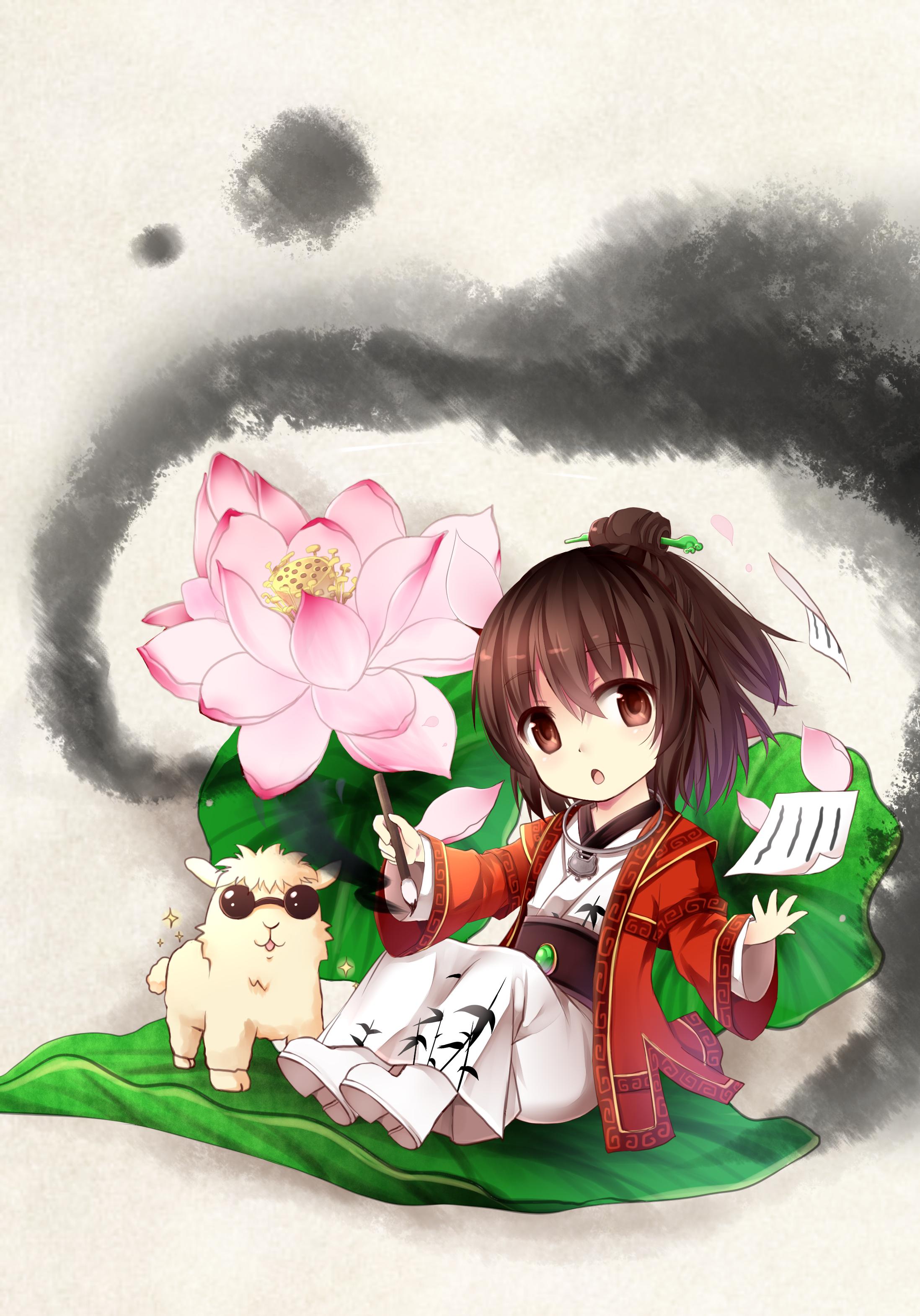 1boy :o absurdres alpaca bamboo_print brown_eyes brown_hair calligraphy_brush chibi chinese_clothes chinese_hairpin coat flower full_body gyaza hair_bun hanfu highres holding_calligraphy_brush holding_paintbrush ink looking_at_viewer lotus lotus_leaf paper pink_flower ponytail red_coat short_hair solo white_footwear xiahou_jinxuan xianjian_qixia_zhuan xianjian_qixia_zhuan_5_qianzhuan