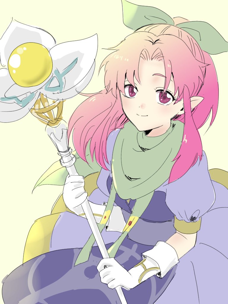 1girl blue_dress closed_mouth dress gloves high_ponytail holding holding_staff holding_weapon long_hair looking_at_viewer millie_chliette pointy_ears ponytail simple_background smile solo staff star_ocean star_ocean:_first_departure weapon white_background white_gloves