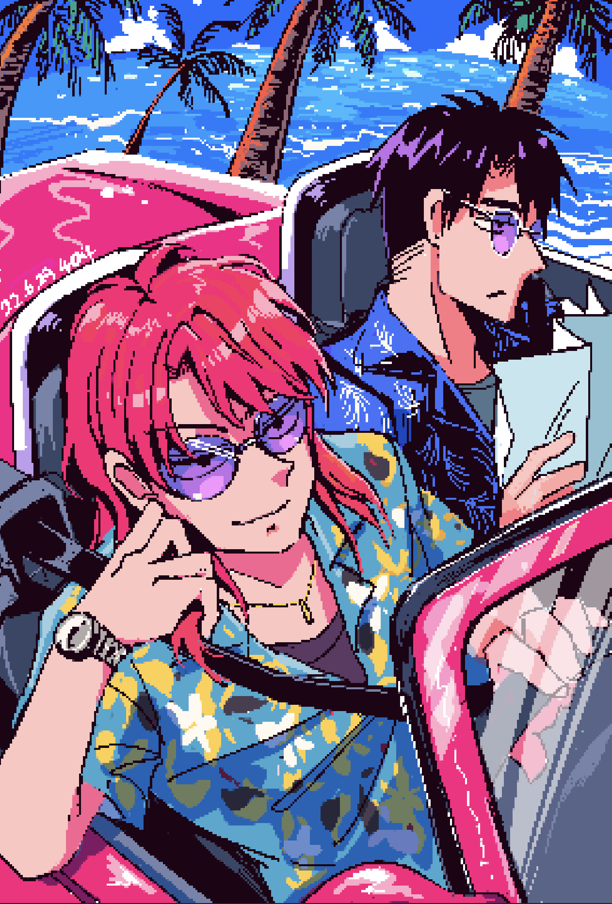 2boys alternate_costume black_eyes black_hair black_shirt blue_shirt blue_sky car closed_mouth cloud commentary_request convertible dated day driving expressionless fisheye hawaiian_shirt highres holding ichijou_seiya jewelry tobaku_mokushiroku_kaiji long_hair male_focus motor_vehicle multiple_boys murakami_tamotsu necklace ocean outdoors palm_tree pink_hair pixel_art purple-tinted_eyewear shirt short_hair sky smile sunglasses tinted_eyewear tree undershirt unknown03162 upper_body watch wristwatch