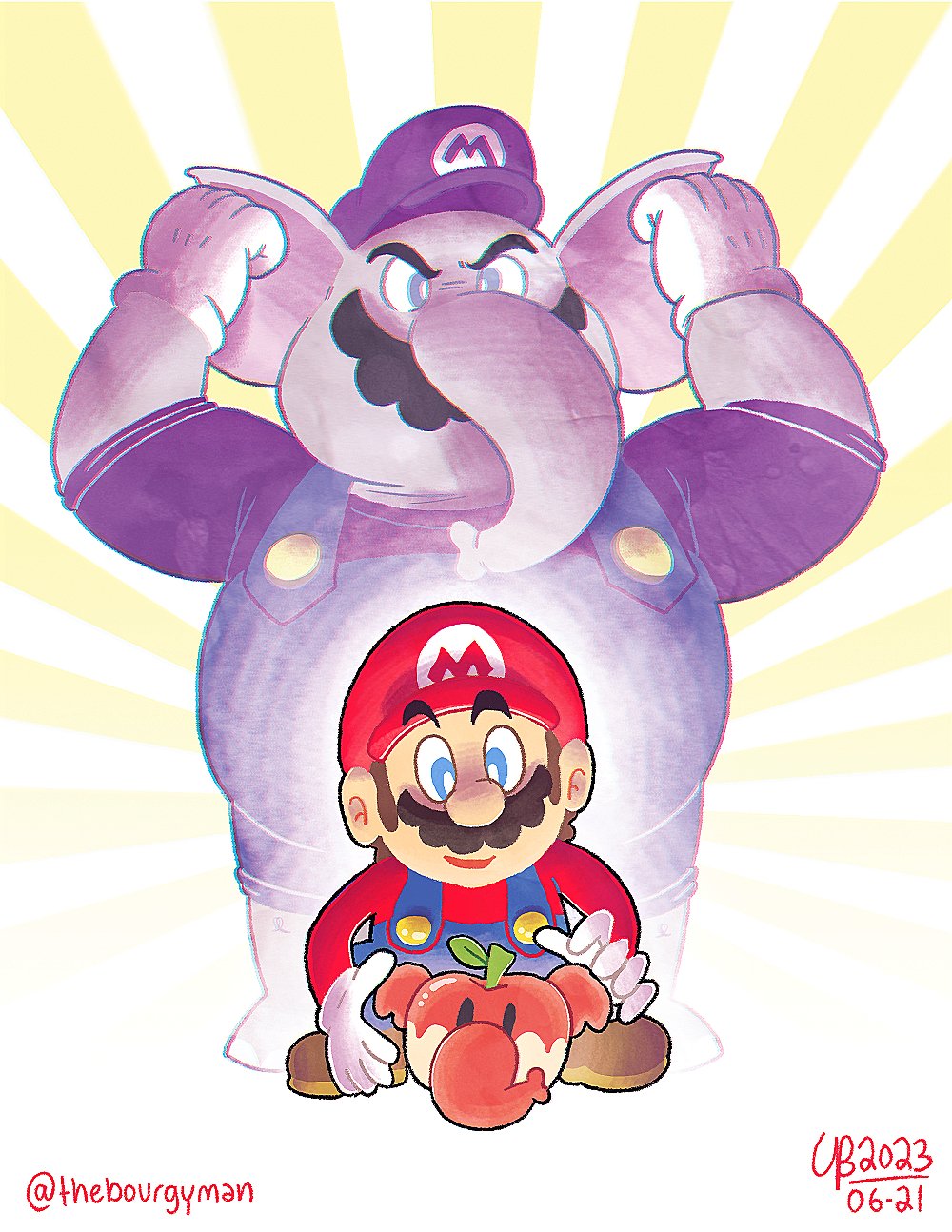 1boy animal_ears blue_eyes brown_hair elephant_ears elephant_fruit elephant_mario facial_hair grin hat highres looking_at_viewer mario mario_(series) mustache nintendo overalls power-up smile super_mario_bros._wonder thebourgyman transformation