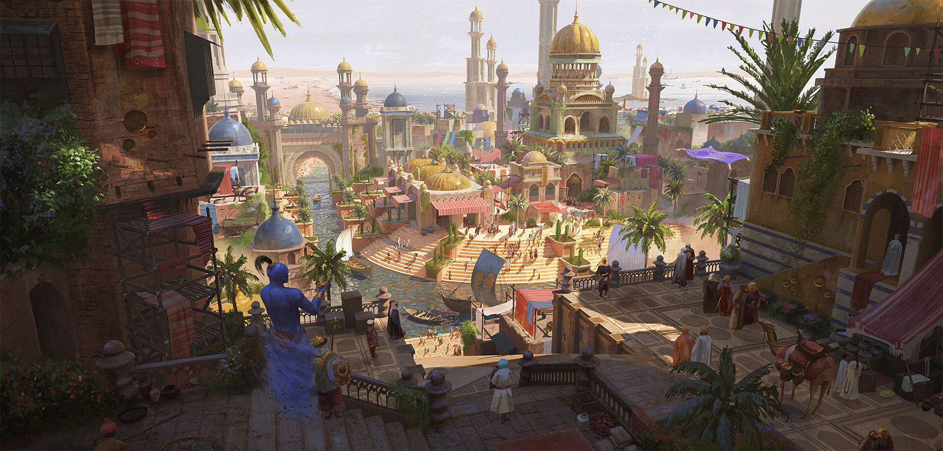 aladdin_(movie) bird boat building bush camel canopy_(shelter) city cityscape commentary cyclecircle day dromedary_camel english_commentary fantasy gate genie_(aladdin) highres mountainous_horizon outdoors palm_tree people polearm railing river sail scaffolding scenery shadow shield stairs tree walking water watercraft weapon wide_shot window
