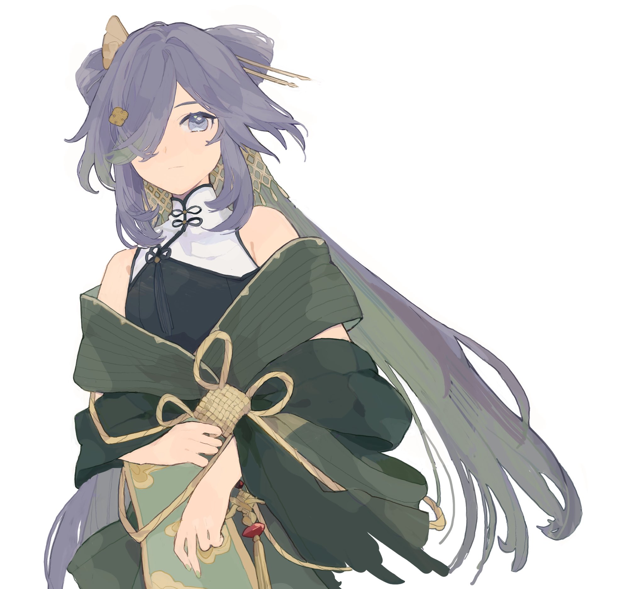 1girl bare_shoulders black_dress blue_eyes closed_mouth copyright_request dress hair_ornament hair_over_one_eye hair_stick highres long_hair looking_at_viewer mogomaco purple_hair simple_background sleeveless sleeveless_dress solo very_long_hair white_background