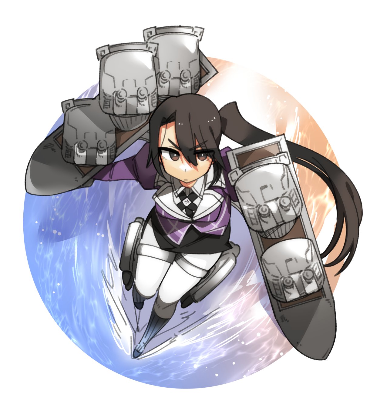 1girl absurdly_long_hair black_hair black_skirt breasts brown_eyes cannon collared_shirt full_body gloves hair_between_eyes hairband higaragi highres jacket juliet_sleeves kantai_collection long_hair long_sleeves medium_breasts military military_uniform nachi_(kancolle) nachi_kai_ni_(kancolle) neckerchief ocean pantyhose pencil_skirt puffy_sleeves purple_jacket rigging ship_turret shirt side_ponytail skirt solo torpedo_launcher torpedo_tubes very_long_hair water white_gloves white_hairband white_pantyhose