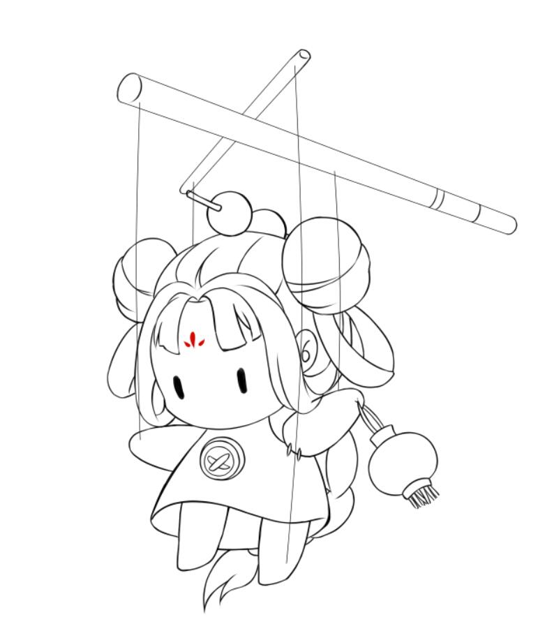 ._. blush braid doll double_bun dress gyaza hair_bun hair_rings lantern lineart long_hair marionette menghuan_xi_you monochrome no_humans no_mouth original puppet puppet_strings single_braid stuffed_toy