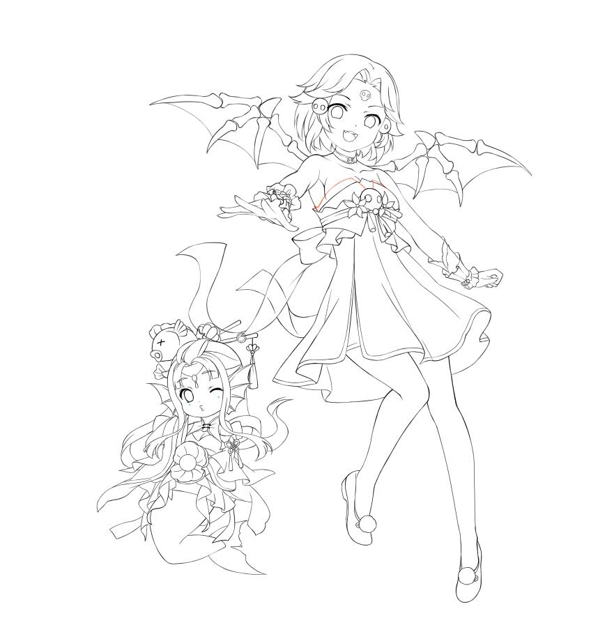 2girls :d back_bow bow breasts chinese_hairpin choker dress fang fins fish_girl fish_hair_ornament fish_tail flats forehead_jewel full_body gem gu_jingling gyaza hair_ornament head_fins lineart long_hair medium_breasts menghuan_xi_you mermaid monochrome monster_girl multiple_girls o-ring o-ring_choker one_eye_closed open_mouth original outstretched_arm outstretched_hand parted_bangs pearl_(gemstone) shell short_hair sideboob skeletal_wings skull_ornament smile tail teeth upper_teeth_only whistling wings wrist_cuffs