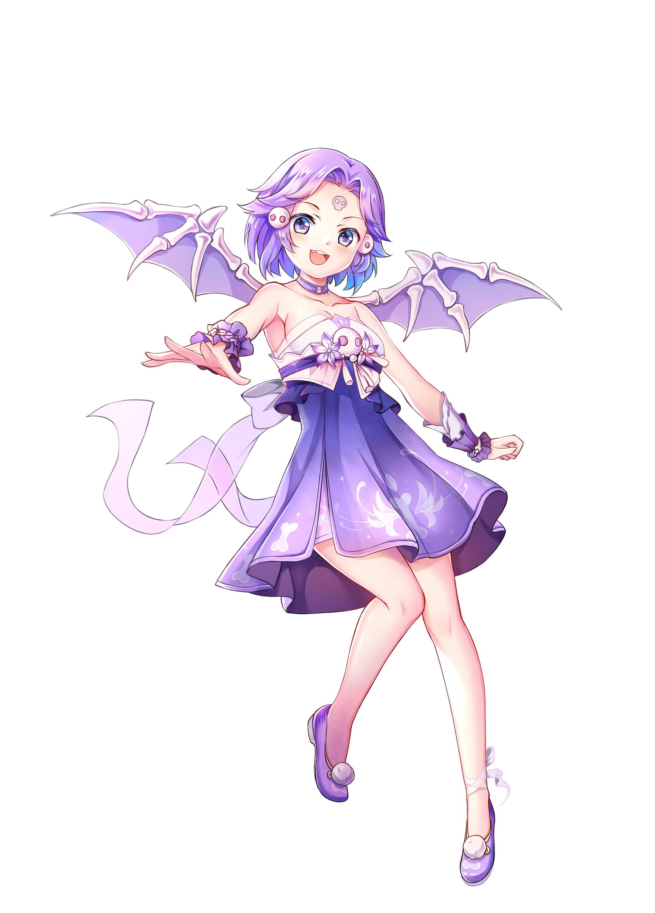 1girl :d absurdres ankle_ribbon bare_legs bare_shoulders breasts choker dress facial_mark fang flats forehead_mark full_body gu_jingling gyaza hair_intakes hair_ornament highres knees_together_feet_apart leg_ribbon looking_at_viewer medium_breasts menghuan_xi_you o-ring o-ring_choker open_mouth outstretched_arm outstretched_hand parted_bangs purple_choker purple_dress purple_eyes purple_footwear purple_hair purple_wings ribbon short_dress short_hair sideboob skeletal_wings skull_ornament smile solo strapless strapless_dress teeth upper_teeth_only white_background white_ribbon wings wrist_cuffs