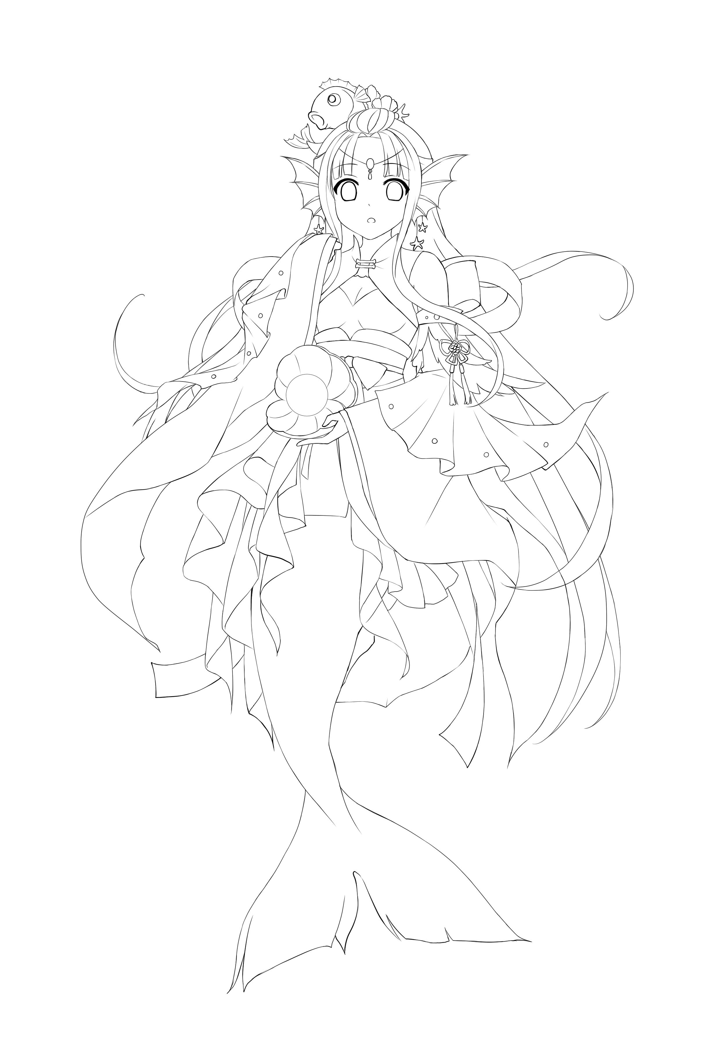 1girl :o absurdres bare_shoulders breasts chinese_clothes cleavage cleavage_cutout clothing_cutout dress fins fish_hair_ornament fish_tail forehead_jewel full_body gem gyaza hair_ornament hair_pulled_back hand_up hanfu head_fins highres holding holding_shell lineart long_hair looking_at_viewer medium_breasts menghuan_xi_you mermaid monochrome monster_girl original parted_bangs pearl_(gemstone) shell shoulder_cutout solo tail very_long_hair wide_sleeves