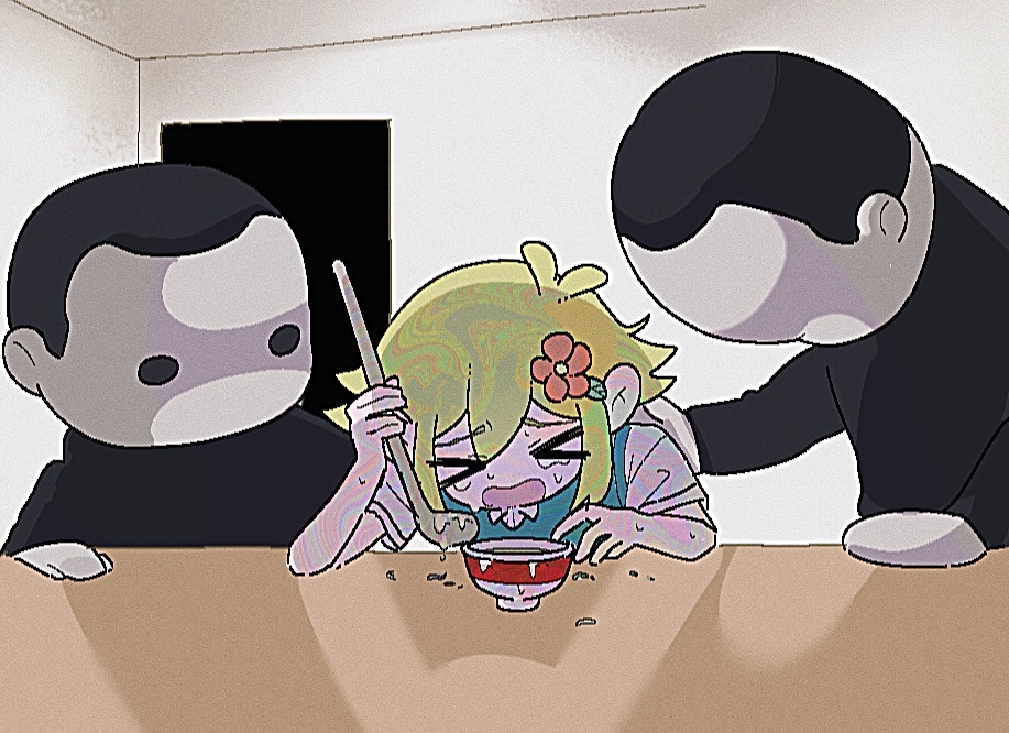 >_< 1boy 2others basil_(faraway)_(omori) basil_(omori) blank_room_soup blonde_hair bowl collared_shirt commentary crying eating flower food green_vest hair_flower hair_ornament hand_on_another's_back holding holding_spoon indoors ladle matouchi_(matouti118) meme multiple_others omori open_mouth shirt short_sleeves soup spoon table upper_body vest white_shirt